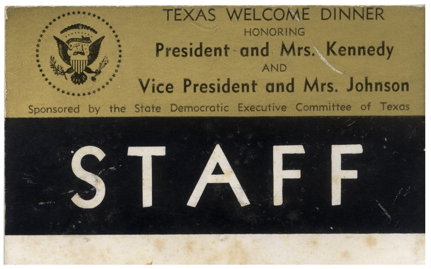 Staff badge for the ''Texas Welcome Dinner'' to be held in Austin on 22 November 1963, the night of President Kennedy's assassination. Black and gold pass with white print bears the event title and the names of Mr. & Mrs. Kennedy and Johnson. Measures 3.75'' x 2.25''. Very good to near fine condition.