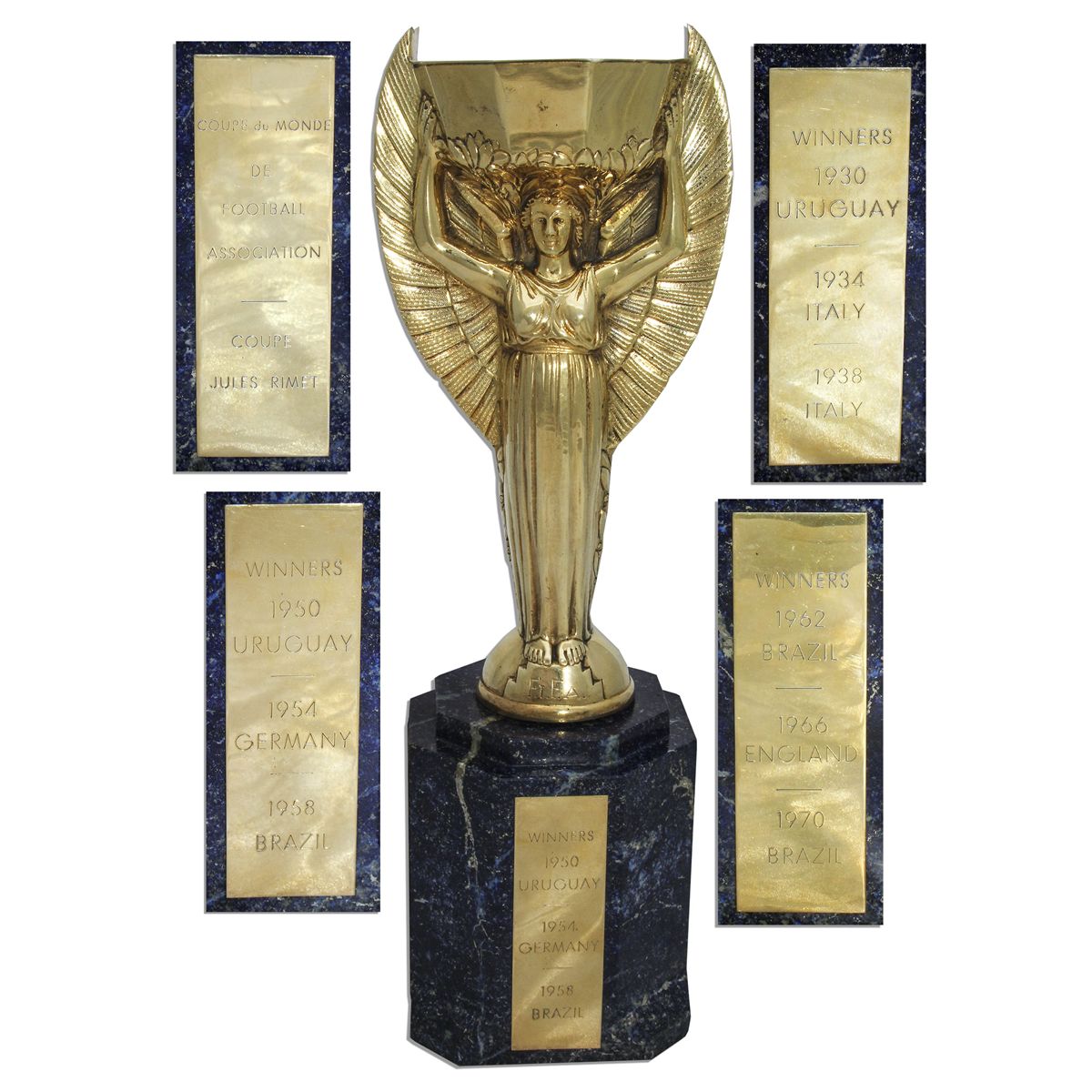 Jules Rimet World Cup trophy from 1970. Trophy was issued by FIFA and remains true to the model debuted in 1930; the work of designer Abel Lafleur. Statue consists of a double-sided figural sculpture of Nike, the winged Grecian victory goddess, holding a decagonal cup over her head. Figure is made of gold-plated sterling silver. Base is in the shape of an octagon, made of lapis lazuli and its sides feature engraved plaques reading, (1) ''Coupe Du Monde De Football Association / Coupe Jules Rimet'', (2) ''Winners 1930 Uruguay / 1934 Italy / 1938 Italy'', (3) ''Winners 1950 Uruguay / 1954 Germany / 1958 Brazil'', and (4) ''Winners 1962 Brazil / 1966 England / 1970 Brazil''. German crown and crescent hallmarks are present on the metal with a 925 mark. Statue measures 13.5'' in height and weighs 8 pounds 13 ounces. Figure rotates on base, else near fine.
