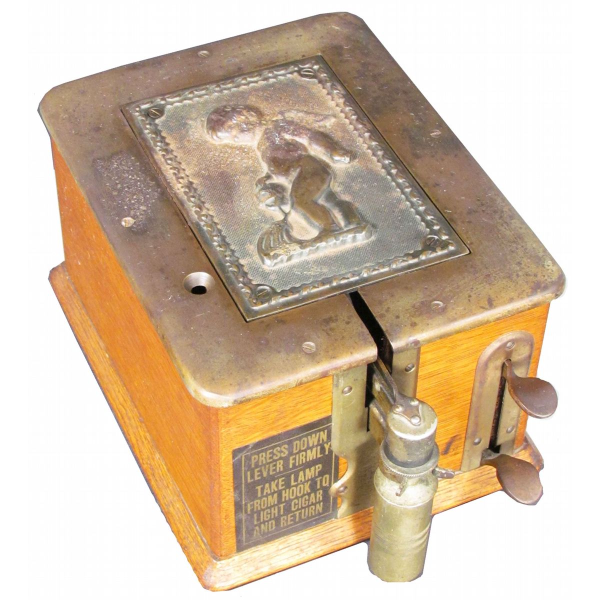 Early and Rare Jump spark cigar Lighter and Cigar Cutter. Brass top with embossed cupid. Marked A. Brott Electric Co. Cleveland, OH. Good original working condition. 7 1/2 X 5 1/2 X 9 1/2 inches.