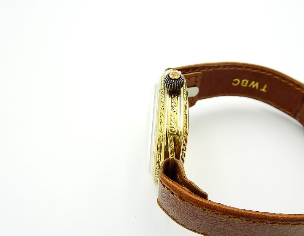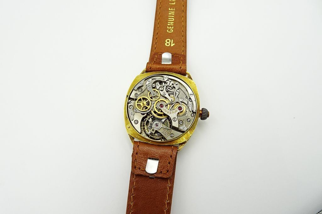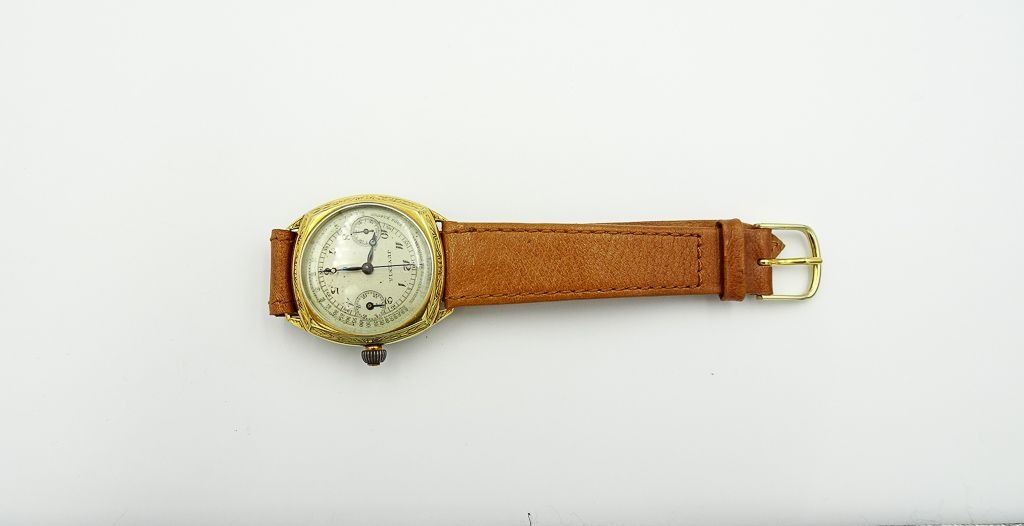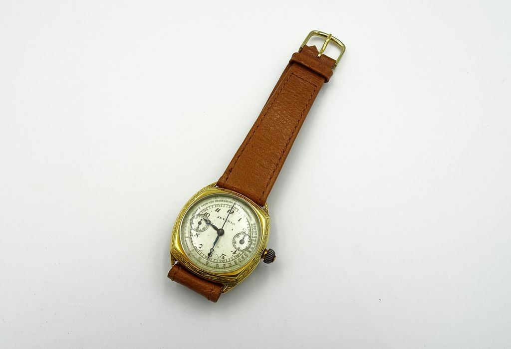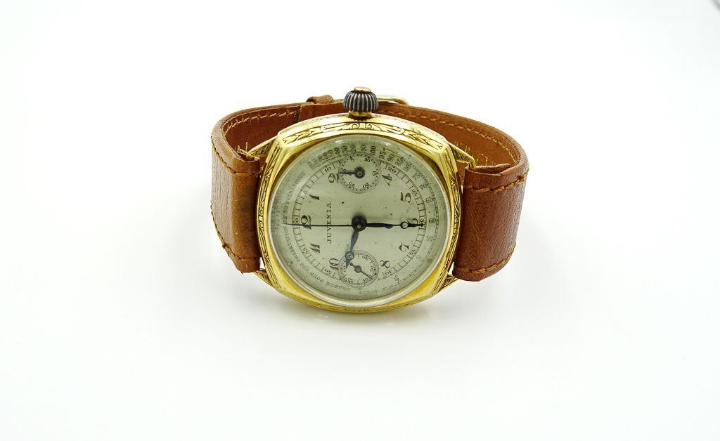 * The watch features a fine and early 18K gold cushion-shaped single button chronograph wristwatch with Pulsometer by Juvenia. * The watch has a hand engraved three piece cushion shaped case measuring 36.00mm lug to lug x 33.00mm without the crown (fixed lug).