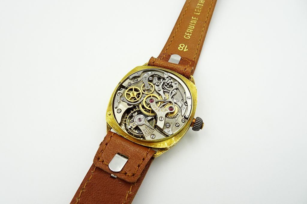 * It has a high grade Swiss nickel plated 18 jewel one button chronograph movement with a bimetallic compensating balance signed Juvenia.