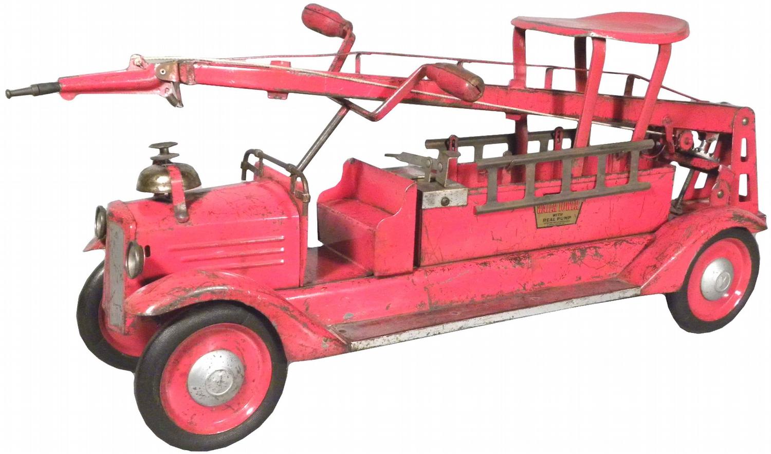 Keystone Pressed Steel Toy Fire Truck. Ride 'Em Water Tower with real pump. Original nozzle. Some paint loss otherwise very good condition. 32 inches long.