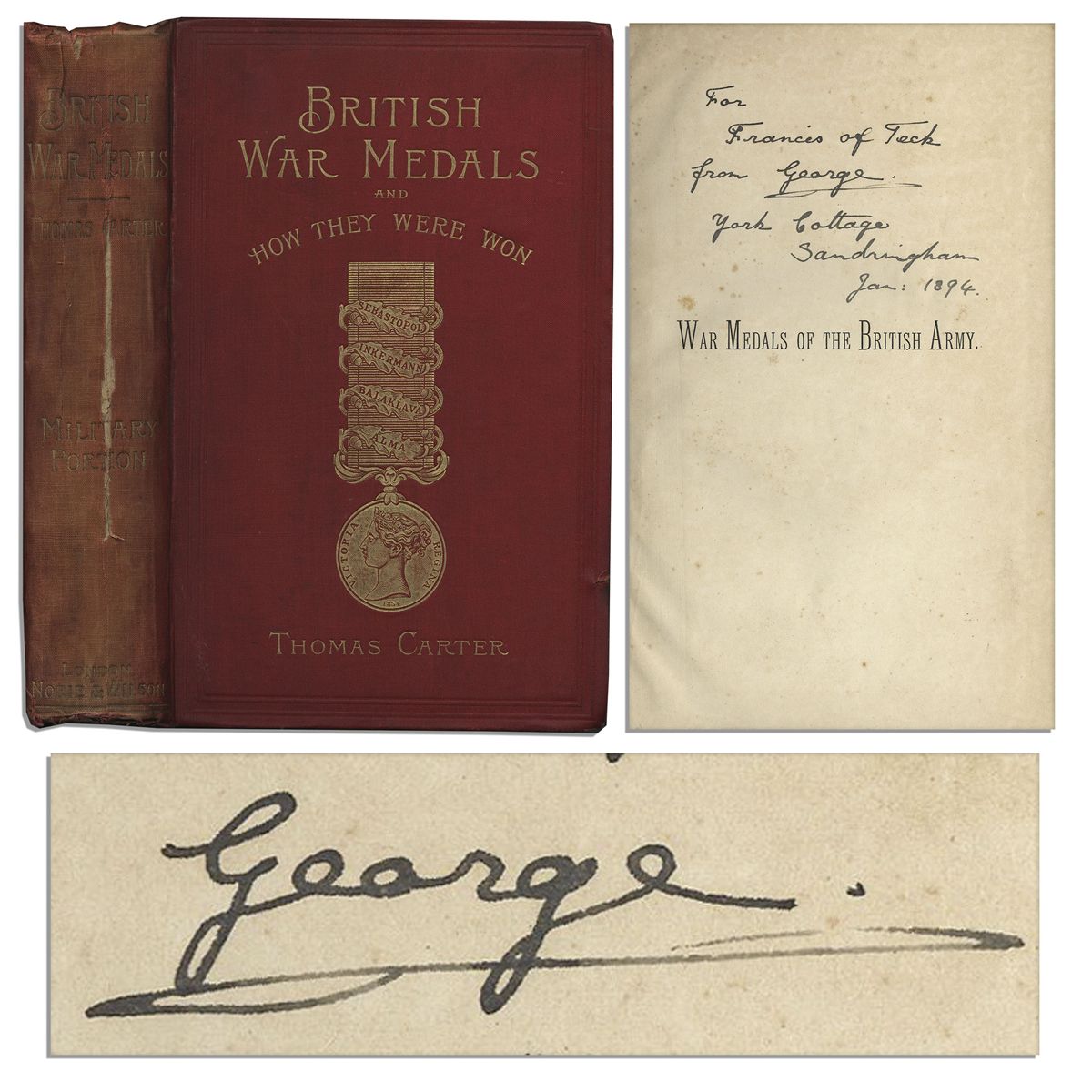 Rare Prince George of Wales, later King George V signed copy of the first edition book, ''War Medals of the British Army'' by Thomas Carter. Published by Norie & Wilson: London: 1893. Inscribed to the King's brother-in-law Prince Francis of Teck on the title page in black ink, ''For Francis of Teck from George. / York Cottage / Sandingham / Jan: 1894.'' 656pp. book is bound in red cloth with gilt lettering and features 26 color plates of medals. Some rubbing and cracking to spine and loose pages, else very good. A nice Royal association signed copy.