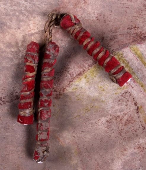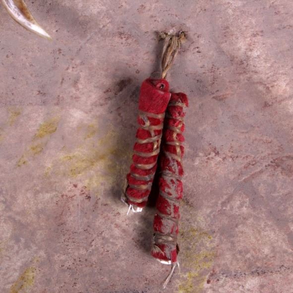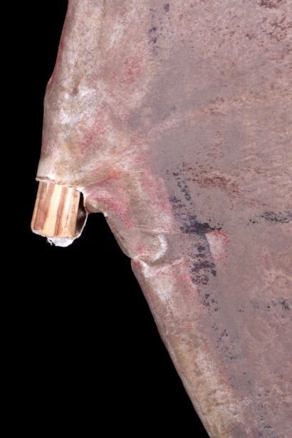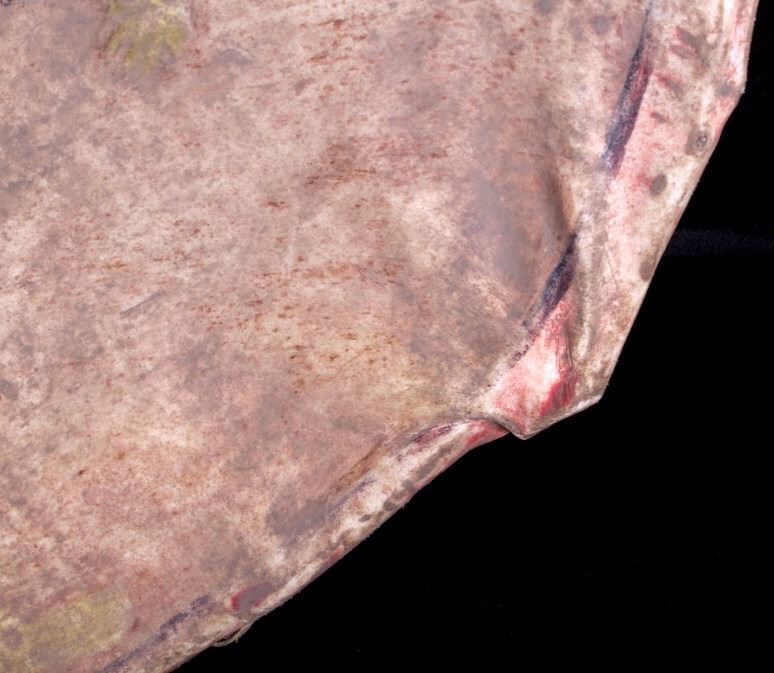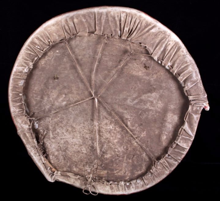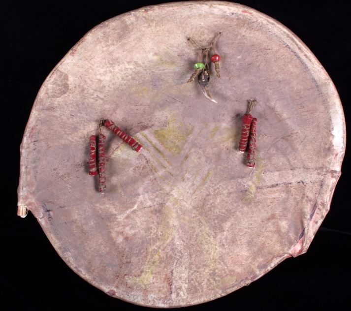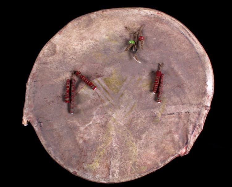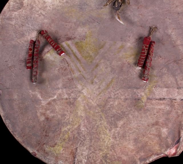 The piece is from the Kiowa Native American Indian rare shield showing a mineral painted great Thunderbird across the front. The paint shows black, red, yellow, and green ocher mineral paints. This quality piece shows trade cloth, glass trade beads, and what is believed to be a badger claw. The piece is Indian tanned hide on a wood stick hoop and canvas wrapped cross support. This is in good condition for its age, The piece shows fading of the painting (see photos). It measures 16" D