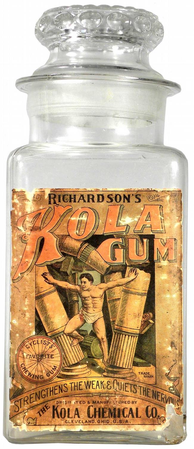 Very Rare Kola Gum Store Jar with original paper label. Kola Chemical Co. Cleveland, OH. Original ground glass lid. Label is stained and worn around edges, jar has hole in front right corner otherwise good condition. 4 3/4 X 11 1/4 X 4 3/4 inches.