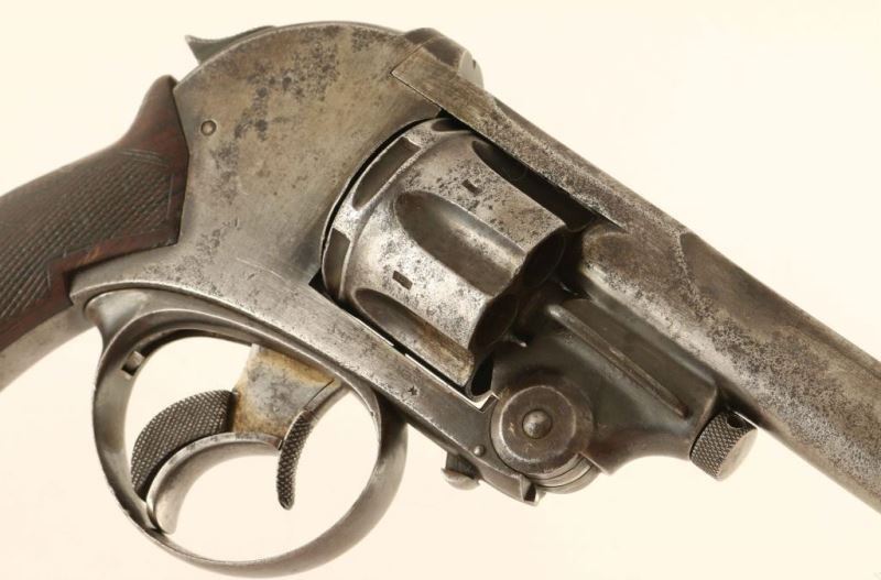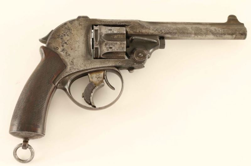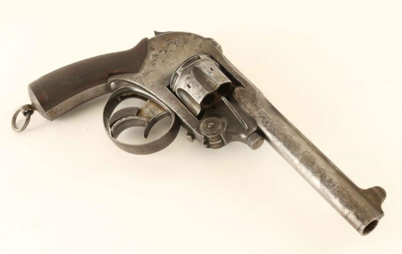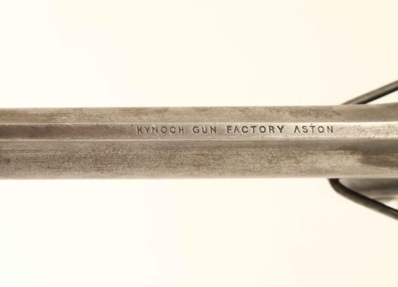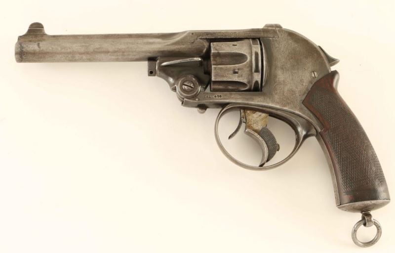 SN: 319 'Second Model' Unique large frame concealed hammer double trigger double action revolver chambered for .476 Eley. The revolver was the invention of the manager of Kynoch Gun Works, Mr. Henry Schlund and only an approximate 600 were ever produced. It features a blued finish, 6" bbl with sighting rib & forged round blade front sight, 'v' notched rear sight, fluted six-shot cylinder with automatic extractor, two triggers - one to cock the firearm(which has a manual decocker) & the other to fire a cartridge, lanyard ring and one-piece checkered walnut wrap-around grip. The revolver predominantly displays an aged grey patina but shows traces of it's original blued finish in the protected areas & scattered pitting on the right side. Action is sound with very good lock up, the bore is good with some pitting, markings are very good and the wood grip is good as worn semi-smooth. Condition is NRA Good. ***Antique Firearm*** From The John F Sukey Collection