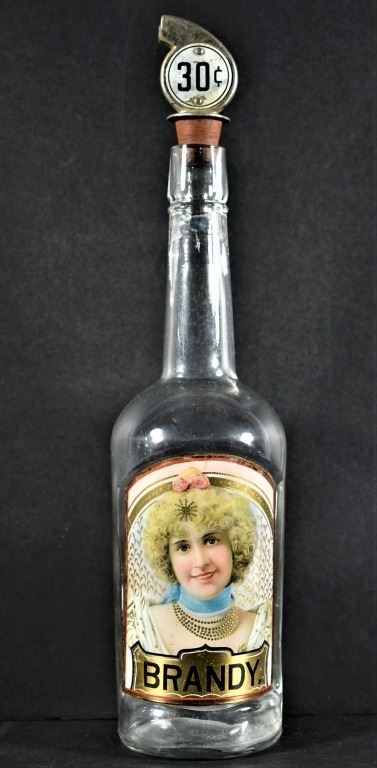 Rare Label Under Glass Back Bar Bottle for Brandy. Pretty blonde woman, no chips or cracks. Comes with 30 cent shot stopper. 11 5/8 inches tall.