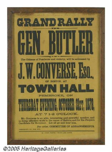 <B>Rare Large Ben Butler Political Broadside</B></I> Butler was a true political gadfly on the Massachussetts and national political scenes from the 1850s through the 1880s, almost the Harold Stassen of his day! This time in 1878, he was the People's Party candidate for Massachusetts governor. In 1884 he would run for president as their candidate. Great, large 15" x 24" display piece, in excellent condition, for this important Civil War general and third-party political figure. Custom-framed. Lot:259
