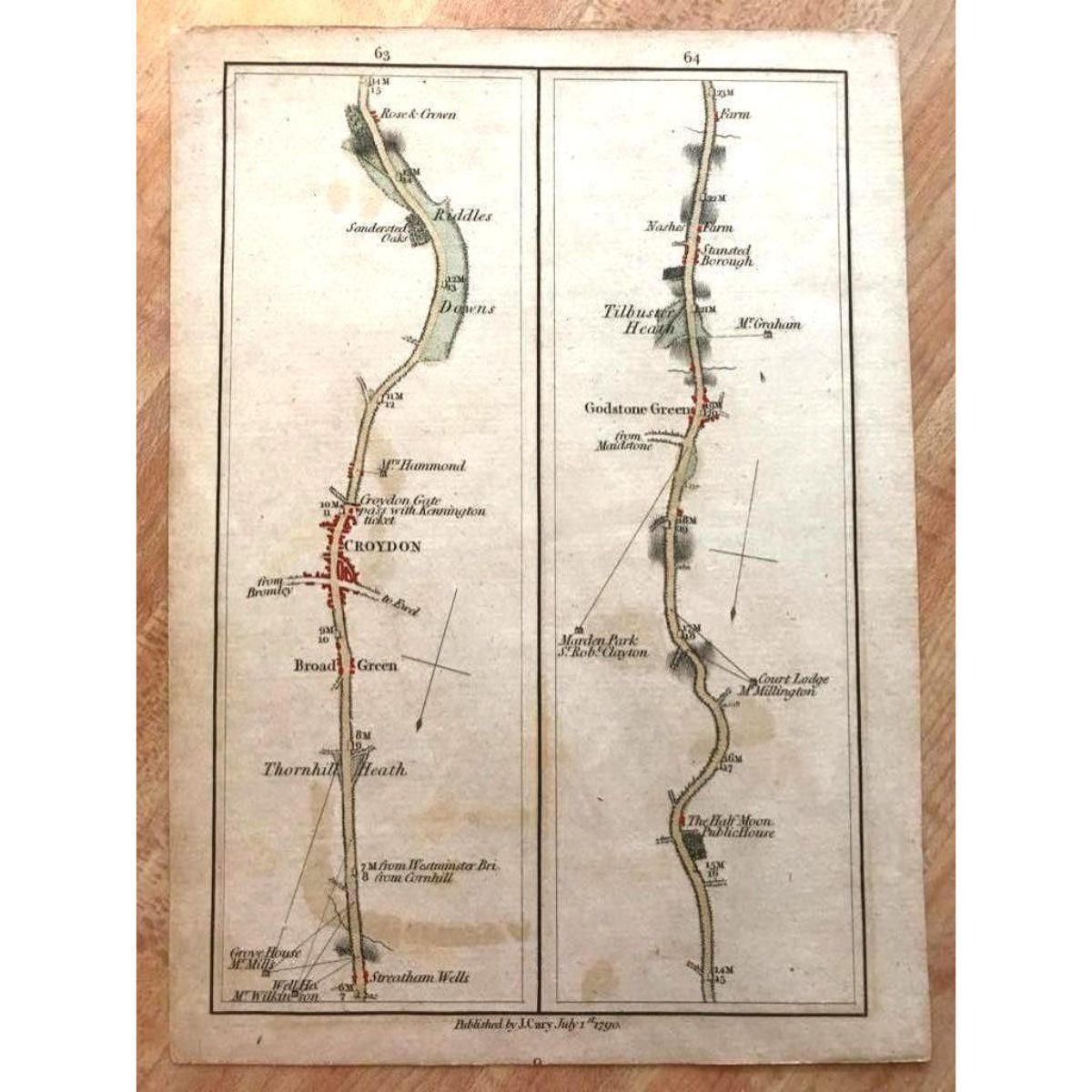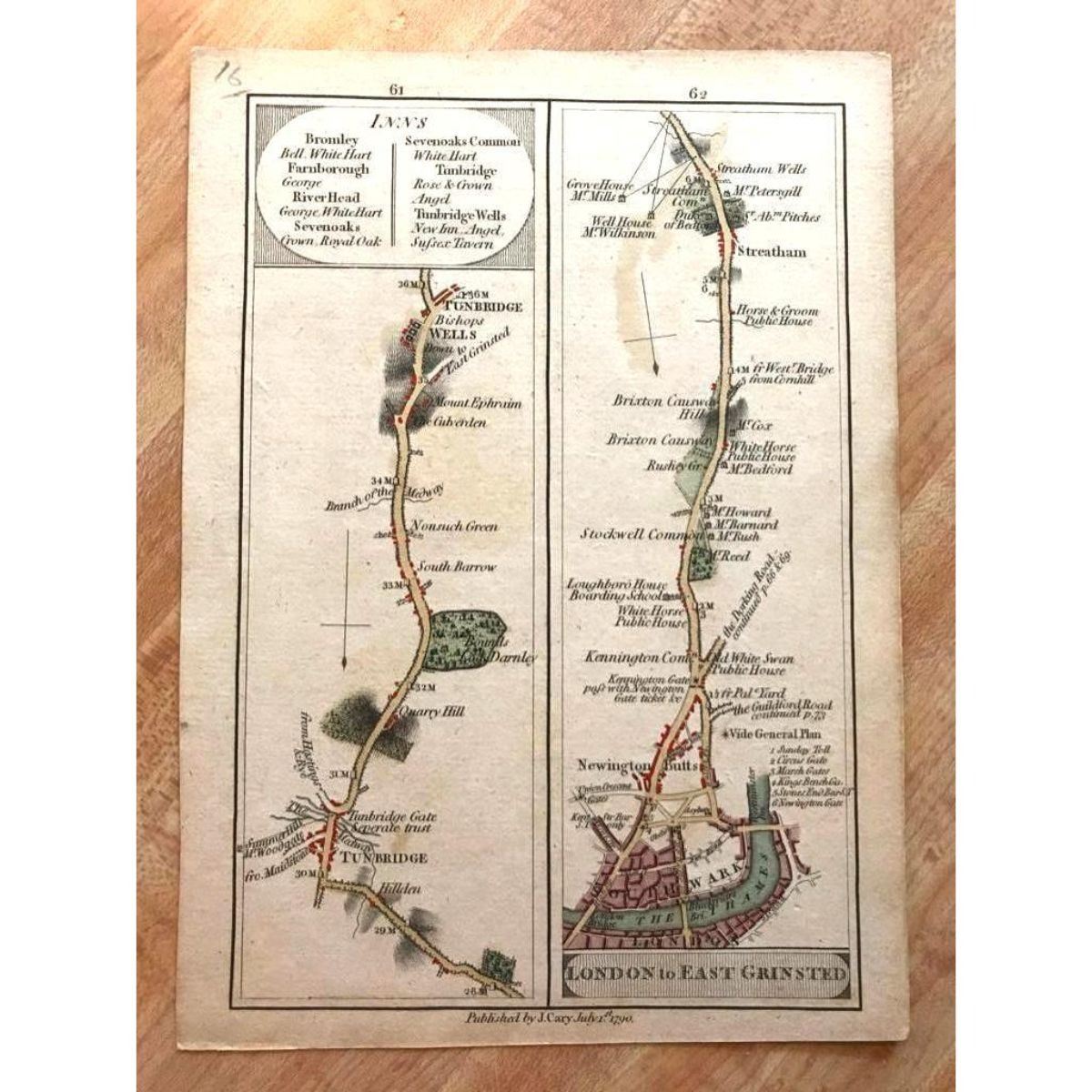 c.1790 English hand-colored road maps showing the journey from London to East Grinsted. Published by J. Cary. Map shows The Thames, London Bridge, Blackfriar's Bridge & including pubs & inns along the road in Bromley, Farnborough, River Head, Sevenoaks, Turnbridge etc. Maps on both front & back. Approx 6" X 8".