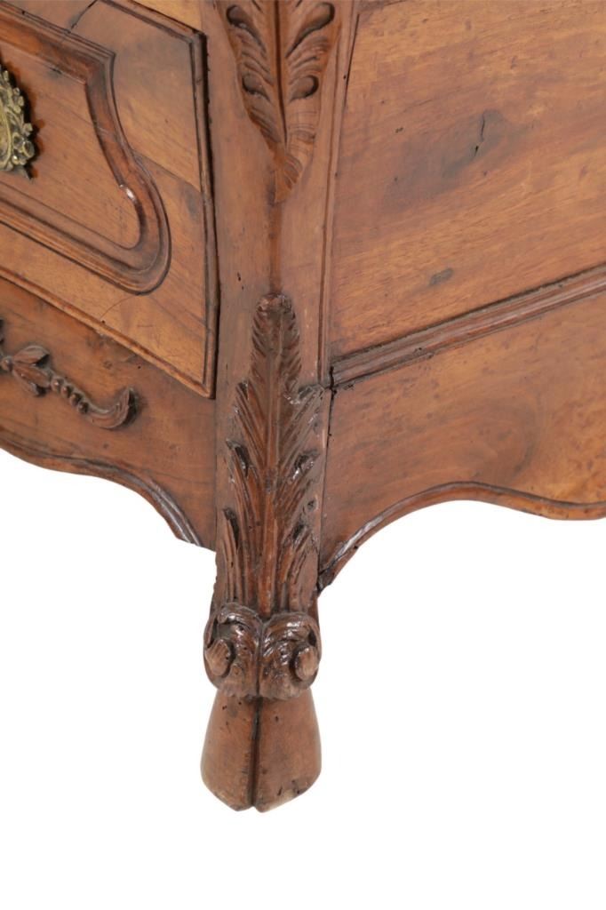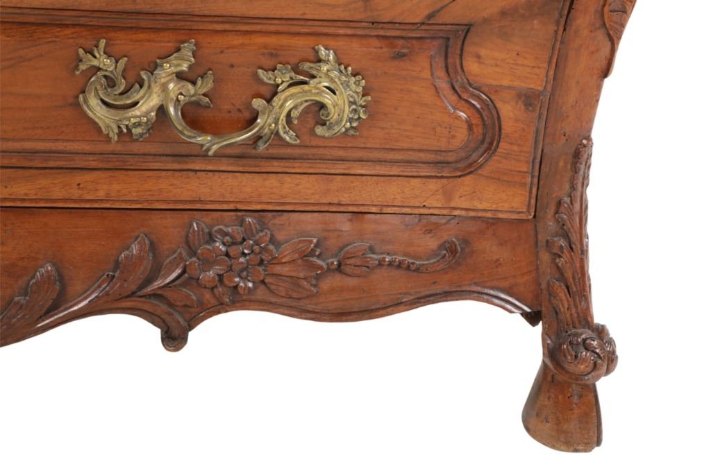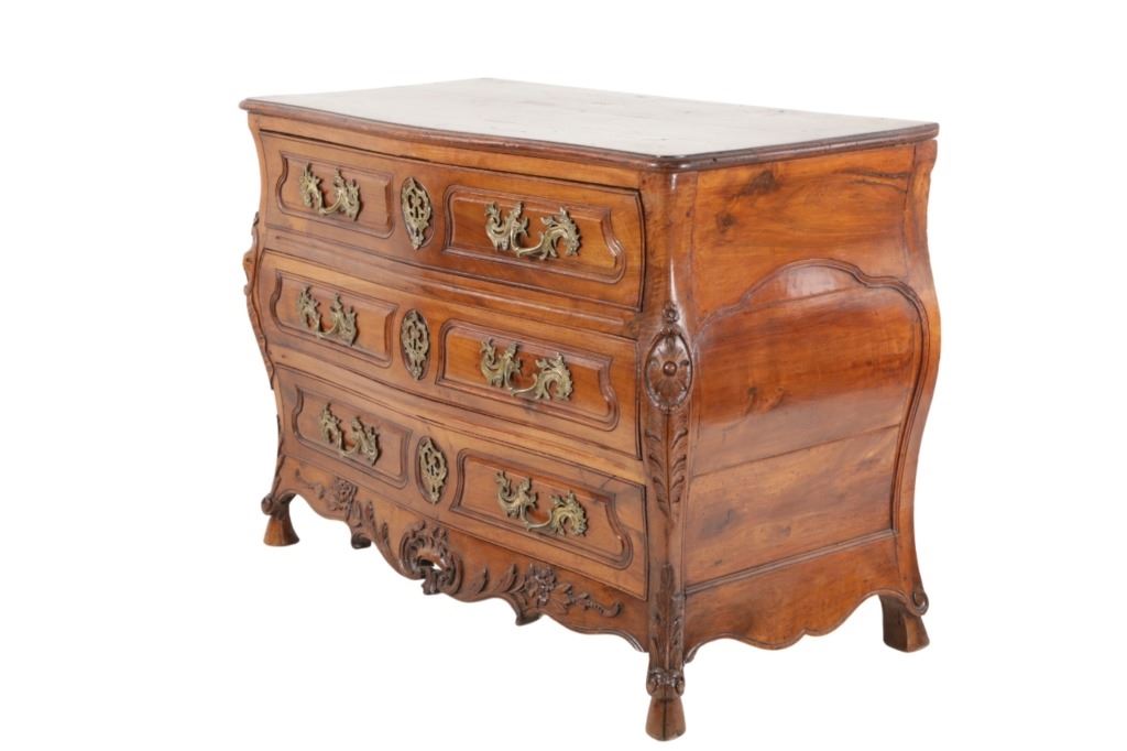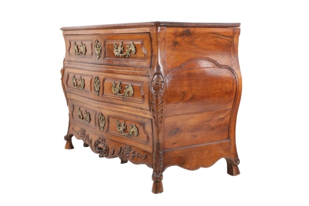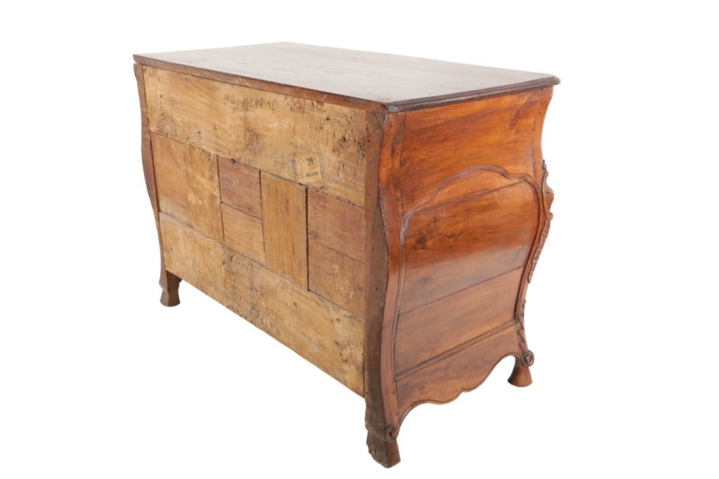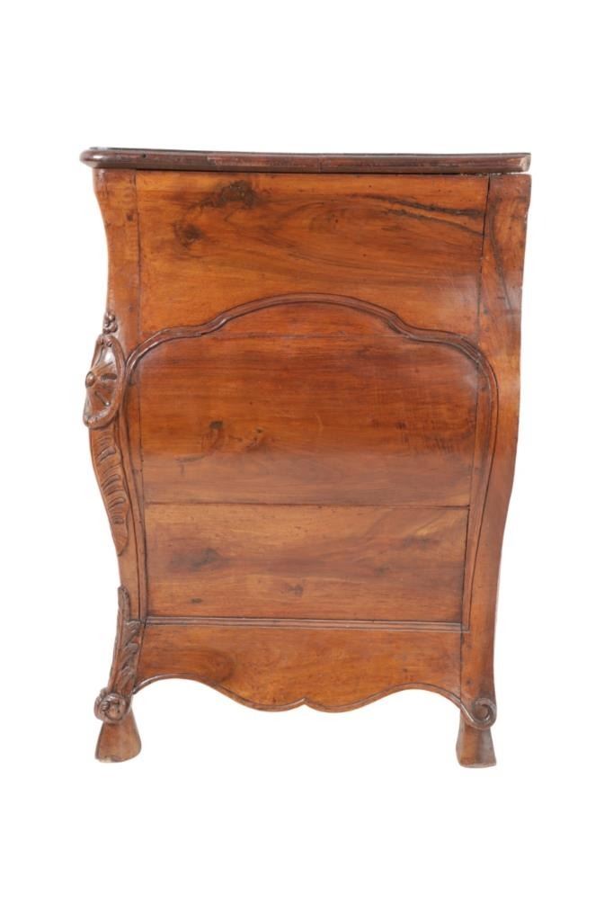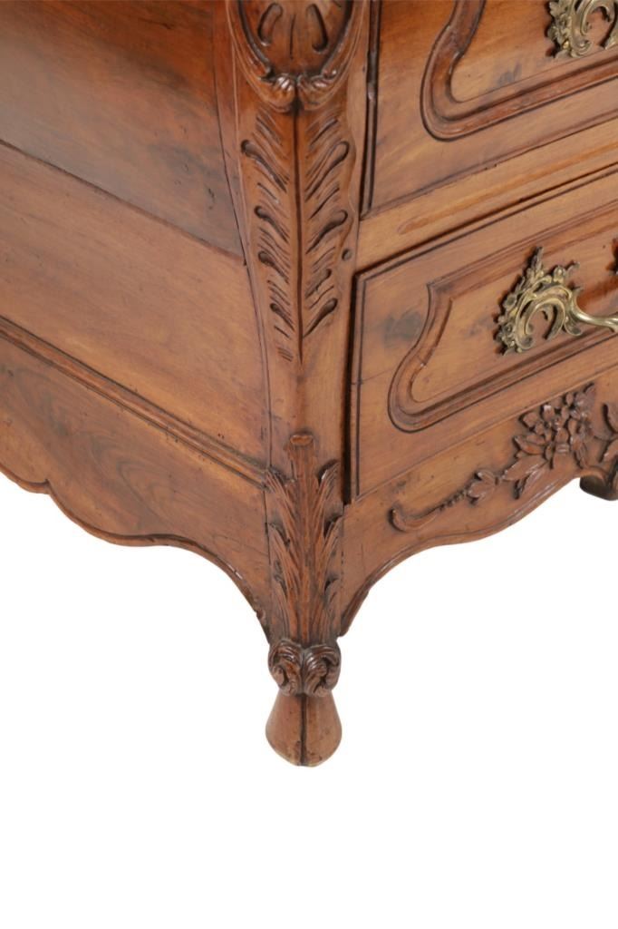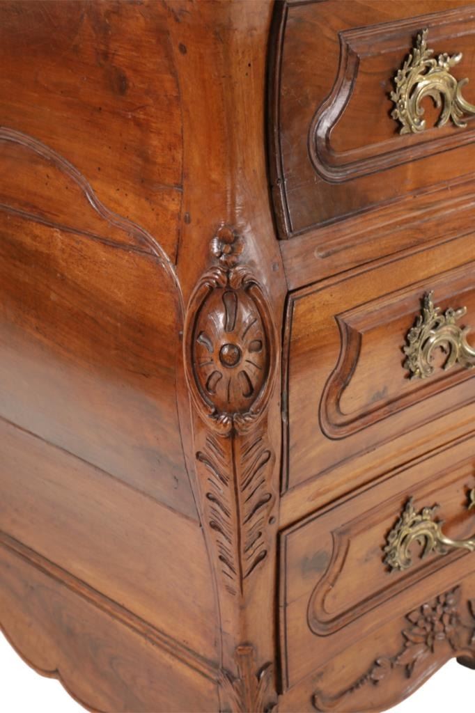 For your consideration is a Rare Late 18th Century French Provincial Louis XV Walnut Bombe Shaped Commode. The eighteenth century is considered the Golden age of French furniture. It was during this time that the most refined and beautiful Royal furniture was made in the busy Paris workshops of Europe's elite cabinet makers. Three-board serpentine top and front, an elaborate handcarved and shaped acanthus leaves skirt apron with pierced cartouche, stands on cabriole legs decorated with acanthus leaves at the shoulder ending with hoof feet, with acanthus leaves and rocaille carved at the top. Scrolled Bombe arched side panels, three front carved Bombe molded drawers with hand-carved acanthus leaves, scalloped shaped top beveled and molded Dupont edge, acanthus inspired drawer pulls and matching escutcheons hardware. The curved forms, lightness, grace, comfort and asymmetry of this period replaced the more formal, boxlike and massive furniture of the Louis XIV style. Excellent quality with superb craftsmanship, the commode is in wonderfully preserved condition, insect damage to backboards, some splits, scratches and minor fading to three-board top, nicely finished. Measures 24.25"D x 48.5"W x 35.5"H and weighs 245 pounds.