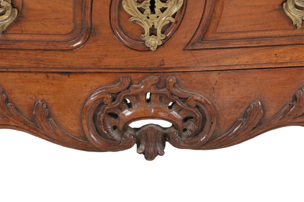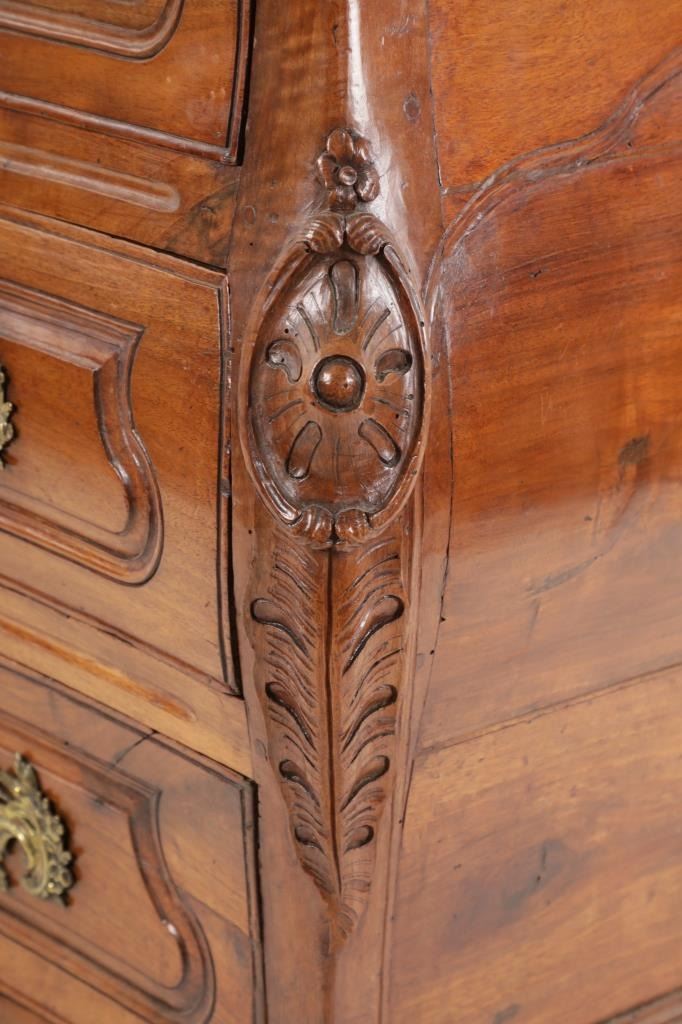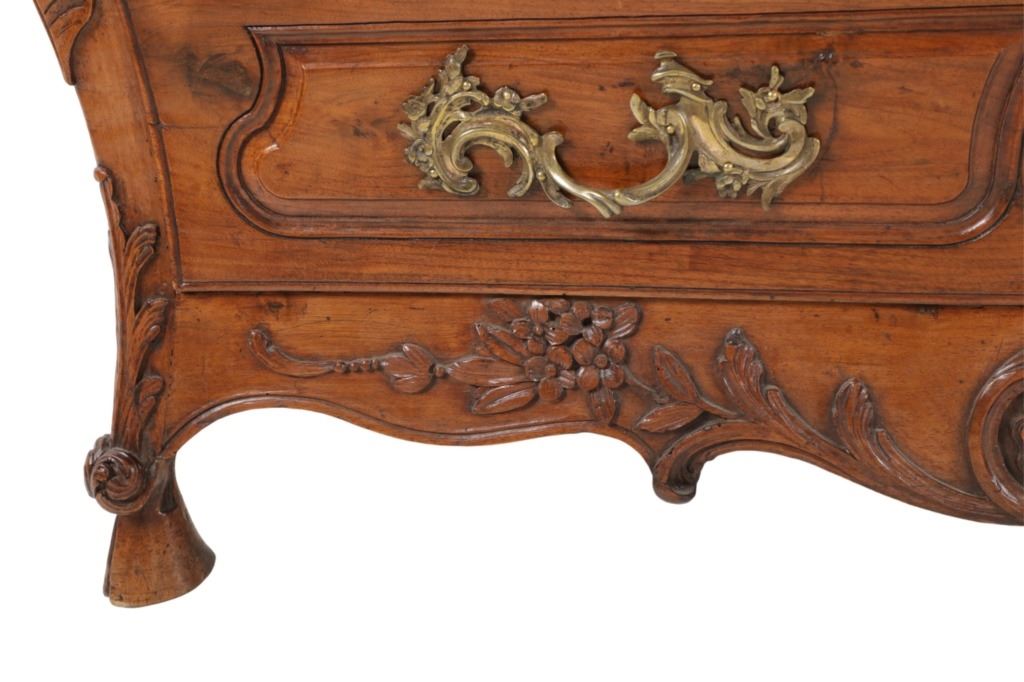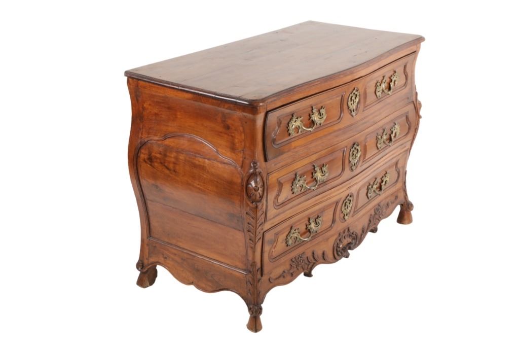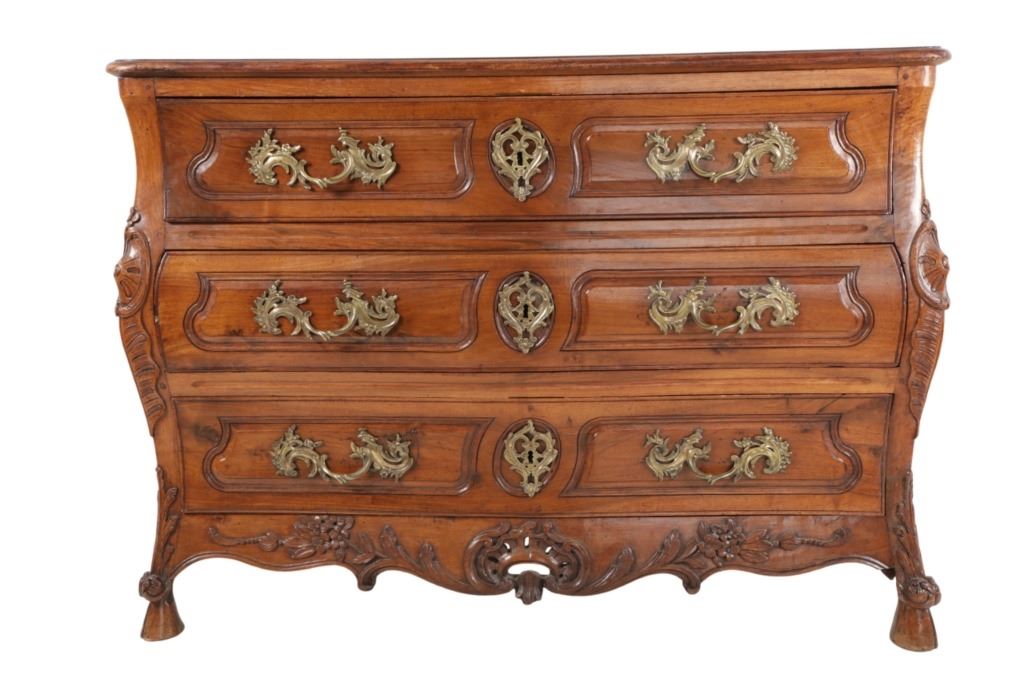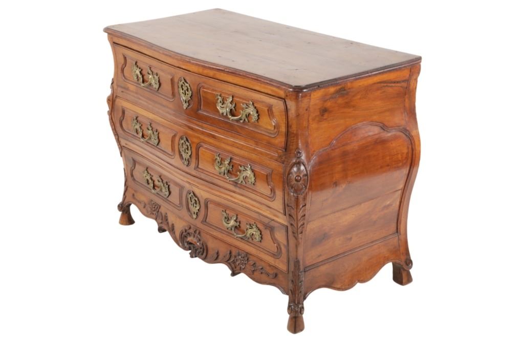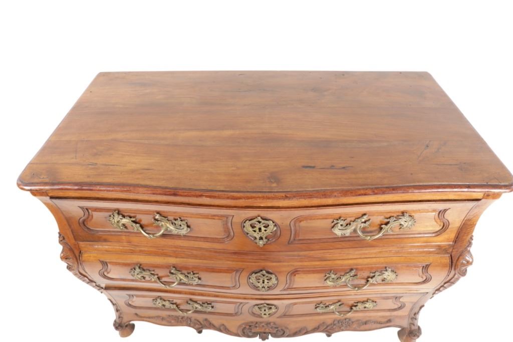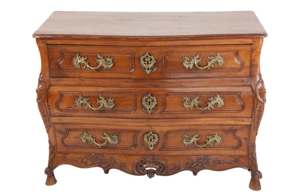 For your consideration is a Rare Late 18th Century French Provincial Louis XV Walnut Bombe Shaped Commode. The eighteenth century is considered the Golden age of French furniture. It was during this time that the most refined and beautiful Royal furniture was made in the busy Paris workshops of Europe's elite cabinet makers. Three-board serpentine top and front, an elaborate handcarved and shaped acanthus leaves skirt apron with pierced cartouche, stands on cabriole legs decorated with acanthus leaves at the shoulder ending with hoof feet, with acanthus leaves and rocaille carved at the top. Scrolled Bombe arched side panels, three front carved Bombe molded drawers with hand-carved acanthus leaves, scalloped shaped top beveled and molded Dupont edge, acanthus inspired drawer pulls and matching escutcheons hardware. The curved forms, lightness, grace, comfort and asymmetry of this period replaced the more formal, boxlike and massive furniture of the Louis XIV style. Excellent quality with superb craftsmanship, the commode is in wonderfully preserved condition, insect damage to backboards, some splits, scratches and minor fading to three-board top, nicely finished. Measures 24.25"D x 48.5"W x 35.5"H and weighs 245 pounds.