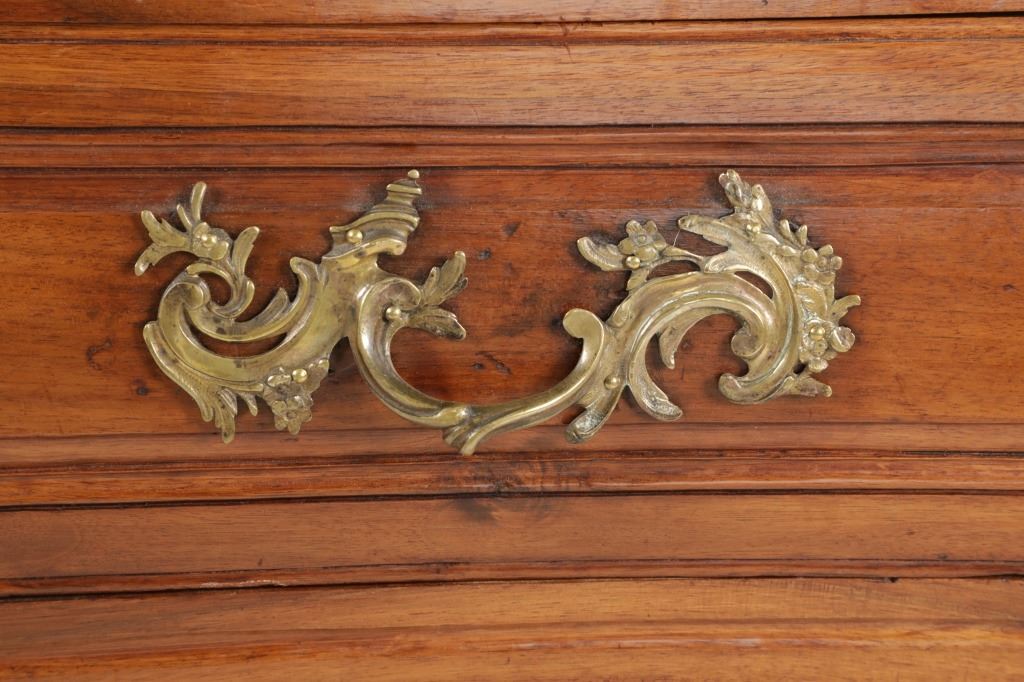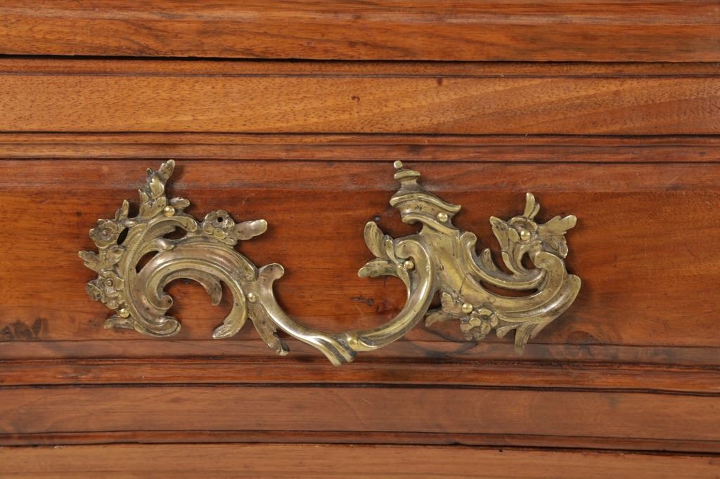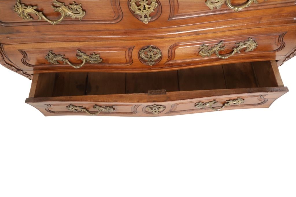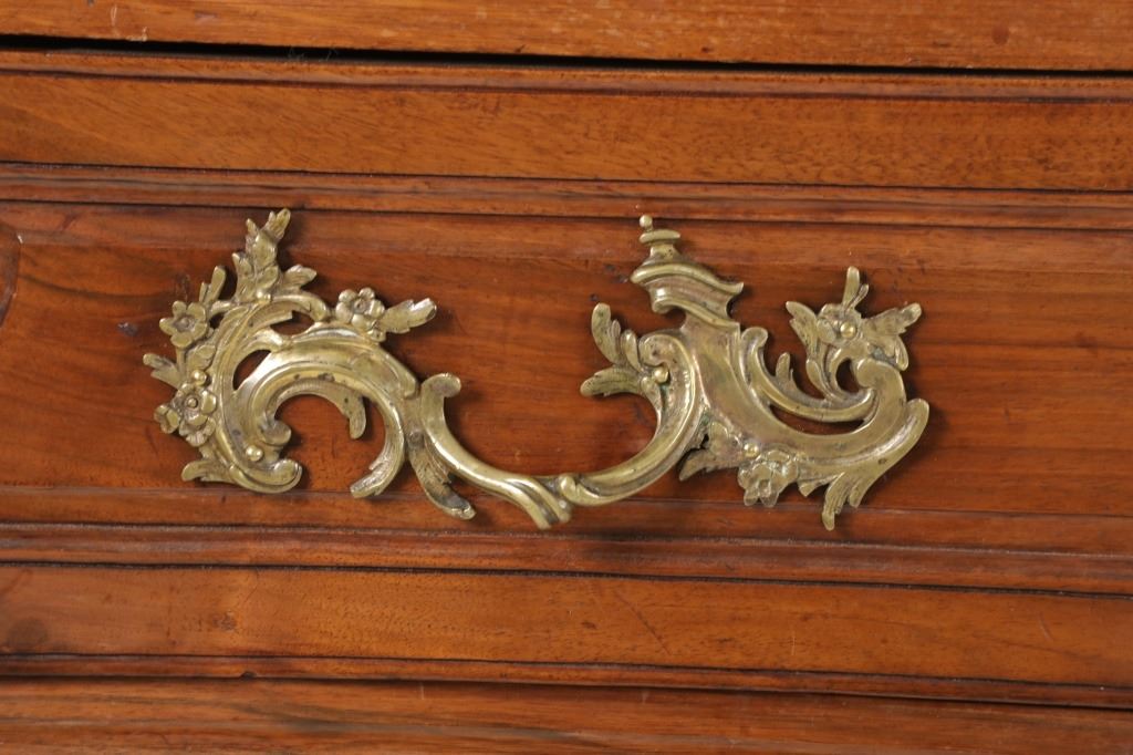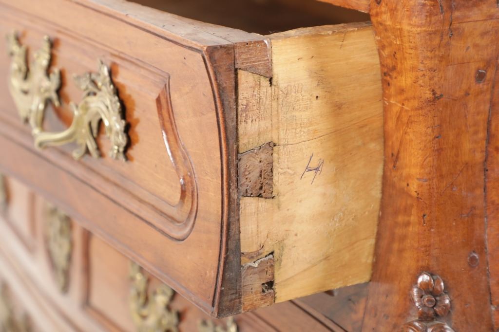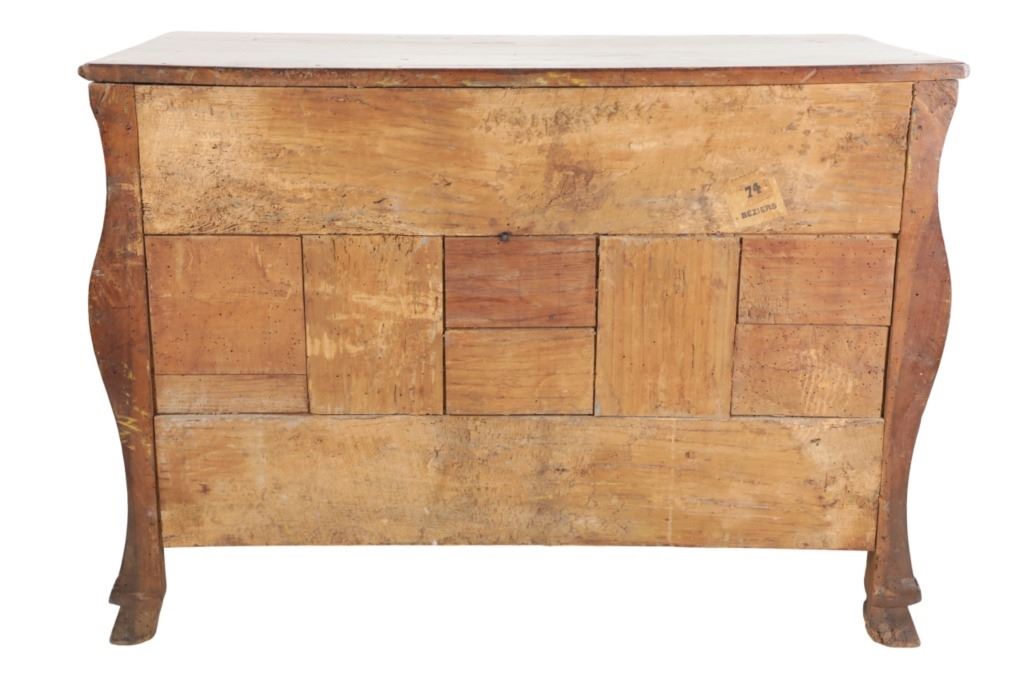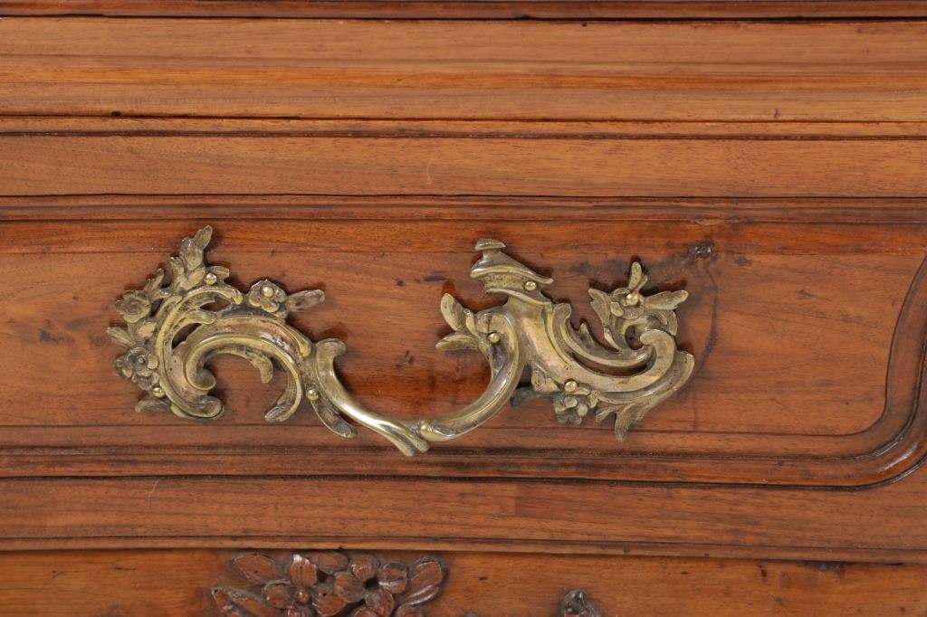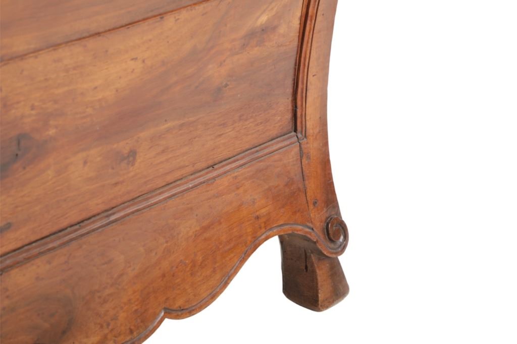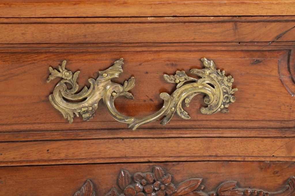 For your consideration is a Rare Late 18th Century French Provincial Louis XV Walnut Bombe Shaped Commode. The eighteenth century is considered the Golden age of French furniture. It was during this time that the most refined and beautiful Royal furniture was made in the busy Paris workshops of Europe's elite cabinet makers. Three-board serpentine top and front, an elaborate handcarved and shaped acanthus leaves skirt apron with pierced cartouche, stands on cabriole legs decorated with acanthus leaves at the shoulder ending with hoof feet, with acanthus leaves and rocaille carved at the top. Scrolled Bombe arched side panels, three front carved Bombe molded drawers with hand-carved acanthus leaves, scalloped shaped top beveled and molded Dupont edge, acanthus inspired drawer pulls and matching escutcheons hardware. The curved forms, lightness, grace, comfort and asymmetry of this period replaced the more formal, boxlike and massive furniture of the Louis XIV style. Excellent quality with superb craftsmanship, the commode is in wonderfully preserved condition, insect damage to backboards, some splits, scratches and minor fading to three-board top, nicely finished. Measures 24.25"D x 48.5"W x 35.5"H and weighs 245 pounds.