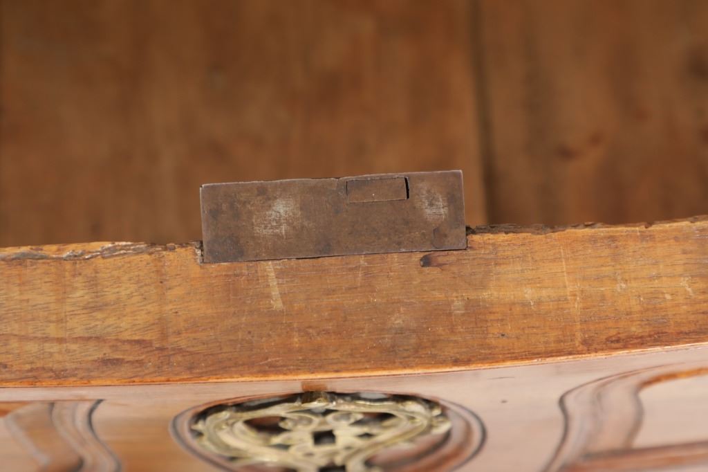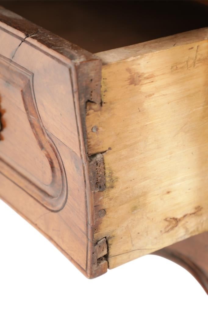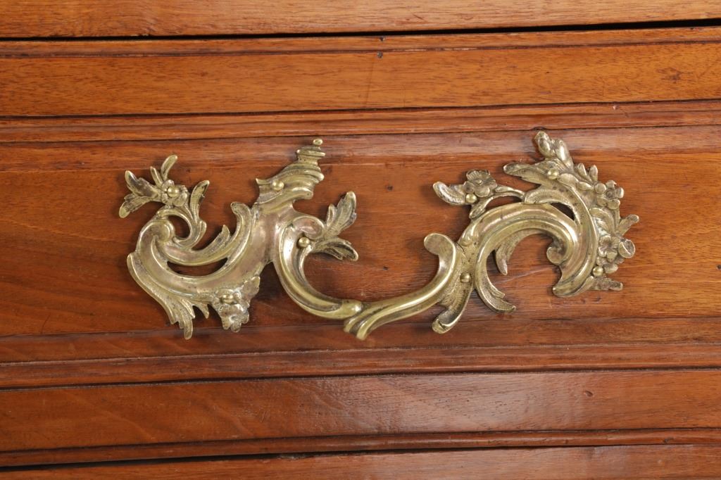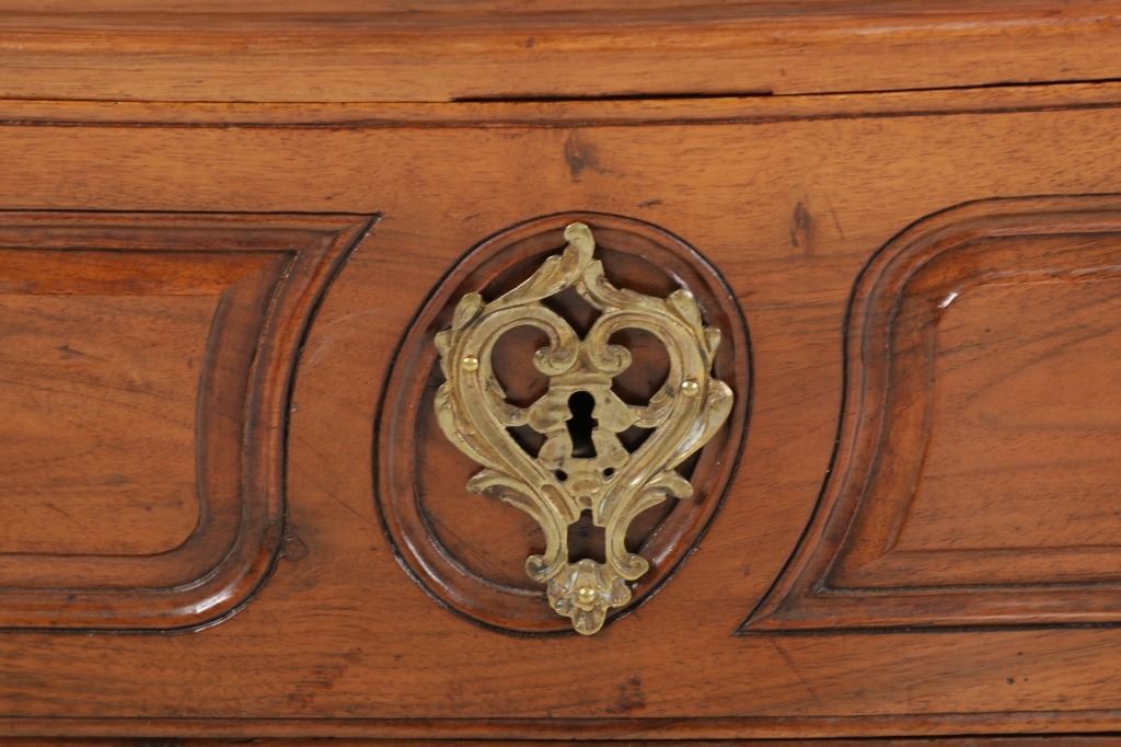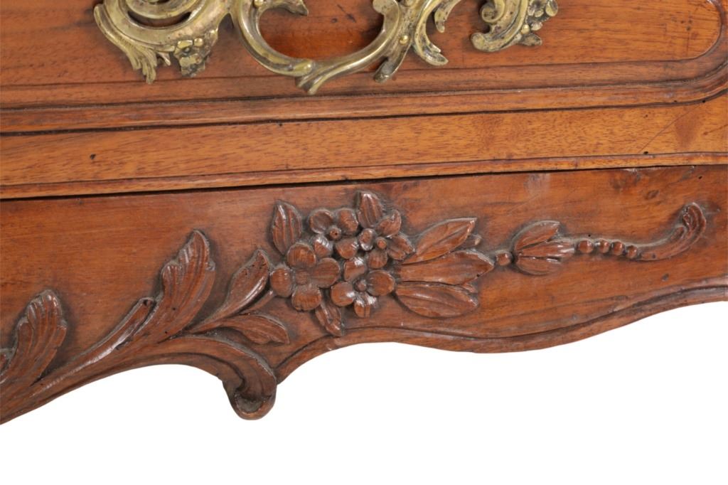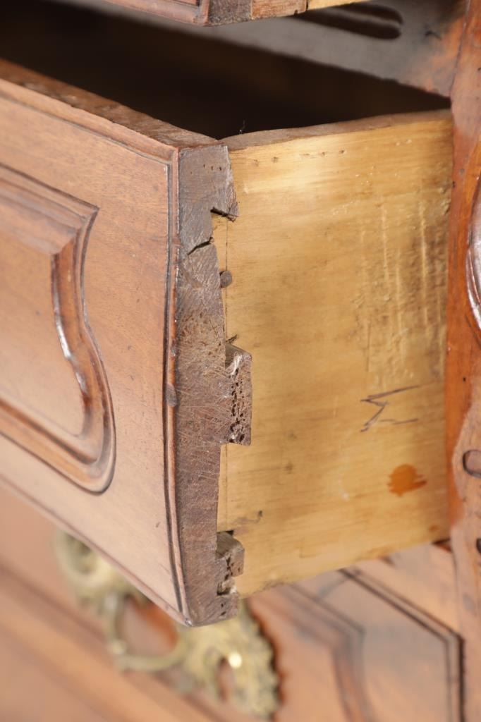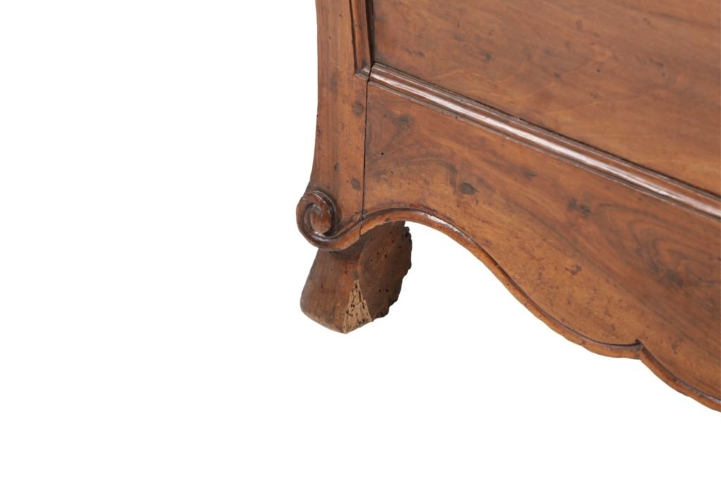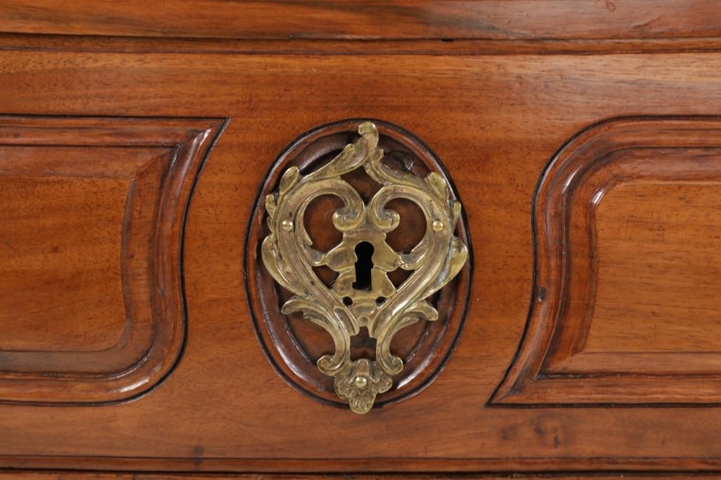 For your consideration is a Rare Late 18th Century French Provincial Louis XV Walnut Bombe Shaped Commode. The eighteenth century is considered the Golden age of French furniture. It was during this time that the most refined and beautiful Royal furniture was made in the busy Paris workshops of Europe's elite cabinet makers. Three-board serpentine top and front, an elaborate handcarved and shaped acanthus leaves skirt apron with pierced cartouche, stands on cabriole legs decorated with acanthus leaves at the shoulder ending with hoof feet, with acanthus leaves and rocaille carved at the top. Scrolled Bombe arched side panels, three front carved Bombe molded drawers with hand-carved acanthus leaves, scalloped shaped top beveled and molded Dupont edge, acanthus inspired drawer pulls and matching escutcheons hardware. The curved forms, lightness, grace, comfort and asymmetry of this period replaced the more formal, boxlike and massive furniture of the Louis XIV style. Excellent quality with superb craftsmanship, the commode is in wonderfully preserved condition, insect damage to backboards, some splits, scratches and minor fading to three-board top, nicely finished. Measures 24.25"D x 48.5"W x 35.5"H and weighs 245 pounds.