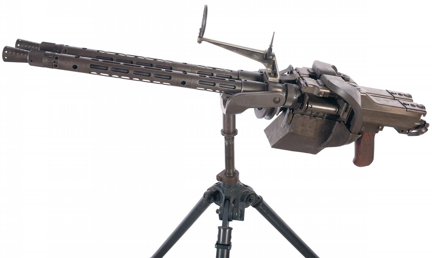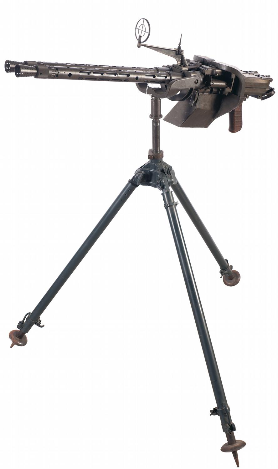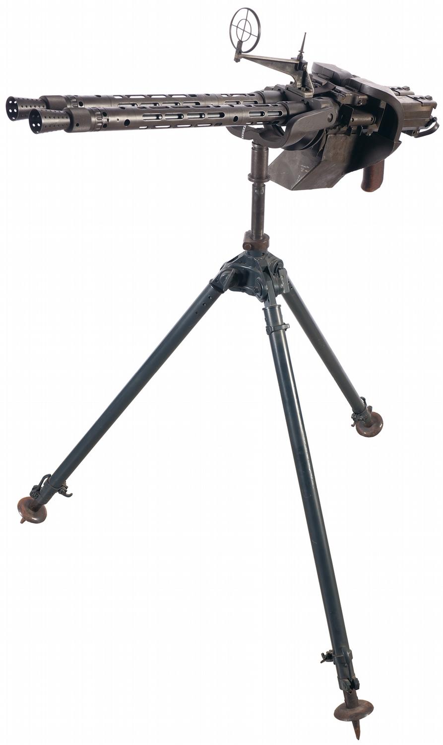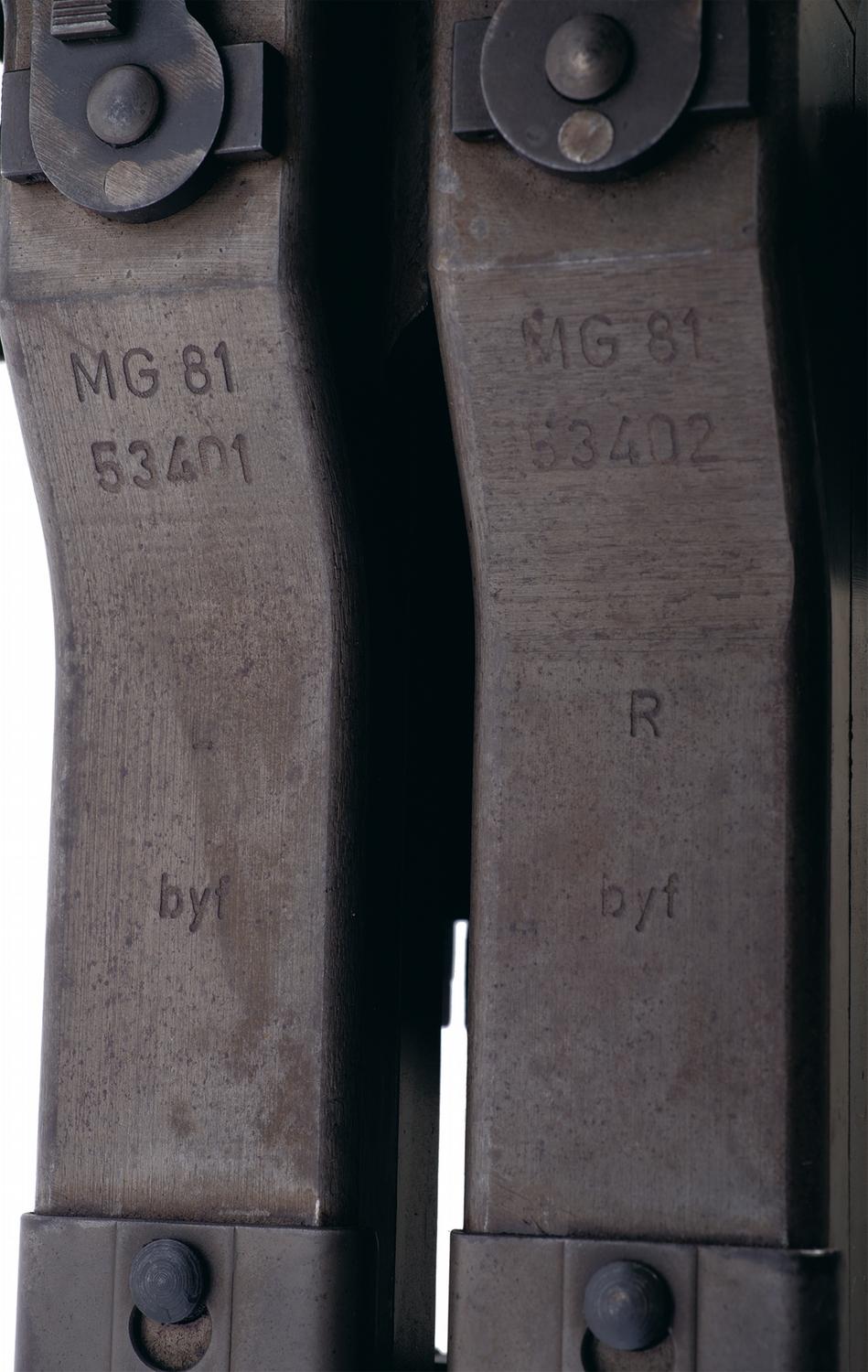 Condition: Excellent plus with 99% of the original late WWII gray/green phosphate finish with some minor wear on the edges and high spots overall with some minor browning on the top covers. The perforated barrel jackets do show some slight thinning on top as that's where it was the easiest area to grab to move or carry the weapons. The tripod is also in excellent condition dark blue Luftwaffe painted finish with only minor handling marks and a few paint nicks. As noted it has matching numbers on the various parts that we could see. A rare example of a WWII Luftwaffe issue twin MG81Z dual machine set.