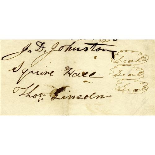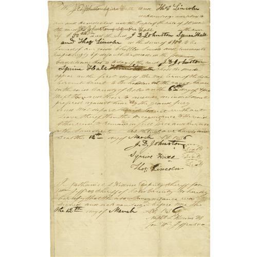 <B> Excessively Rare Legal Document Signed by Abraham Lincoln's Father, Thomas Lincoln (Multiple Times), His Stepbrother, John D. Johnston, and his Step-Brother-in-Law, Squire Hall: An Unobtainable Combination of Autographs</B></I> <BR><BR> (Abraham Lincoln) Thomas Lincoln, John D. Johnson, and Squire Hall; DS by all three, with additional 3 signatures and manuscript of Thomas Lincoln in the text (he has also written the names of Johnston and Hall two additional times). Excessively rare examples of the handwriting of the <I> father of Abraham Lincoln</B></I> with only a few pieces known. Signed "<I>Thos. Lincoln</B></I>" below the signatures of Johnston and Hall, Coles County, Illinois, March 12, 1836, 13 x 8". On November 5, 1835, Johnston and Hall were arrested for "assaulting an officer in attempting to execute process." And for "gaming". (Johnston received three summonses in 1835 to appear as a grand jury witness or as a witness in circuit court). Bail was fixed at $100 on the first charge and at $50 on the second. The assault charge was tried before a jury on April 6th, Johnston was acquitted on Hall was found guilty. Sentencing was postponed until October 8, when Hall received a sentence of a $5 fine and twenty-four hours confinement in the county jail. That same day, both were found not guilty of the gaming charge. This legal document relates to the October 6 trial. It is docketed as an "Appearance bond" and referred to by the deputy sheriff as a "Recognizance." Johnston and Hall then obligated themselves to the State of Illinois for $50 each and the trio severally for $100 and promised to "<I>appear on the first day of the next term of the Coles Circuit Court to Be holden at the court house in the said County of Coles on the 6th day of April then and there to answer and indictment preferred against him by the grand jury and not depart said court without leave thereof then this recognized to be void…</B></I>" Thomas Lincoln must have been acting as a guarantor or legal head of household. Abraham Lincoln recalled his father as poorly educated,…"<I>and never did more in the way of writing than to bunglingly sign his own name…</B></I>" Because of his lack of education and limited writing ability the autograph of Thomas Lincoln is virtually unobtainable. In the last 50 years only three have appeared at auction, including this one at the Crocker sale of Lincoln memorabilia and autographs in 1979. Housed in an elegant slipcase.
