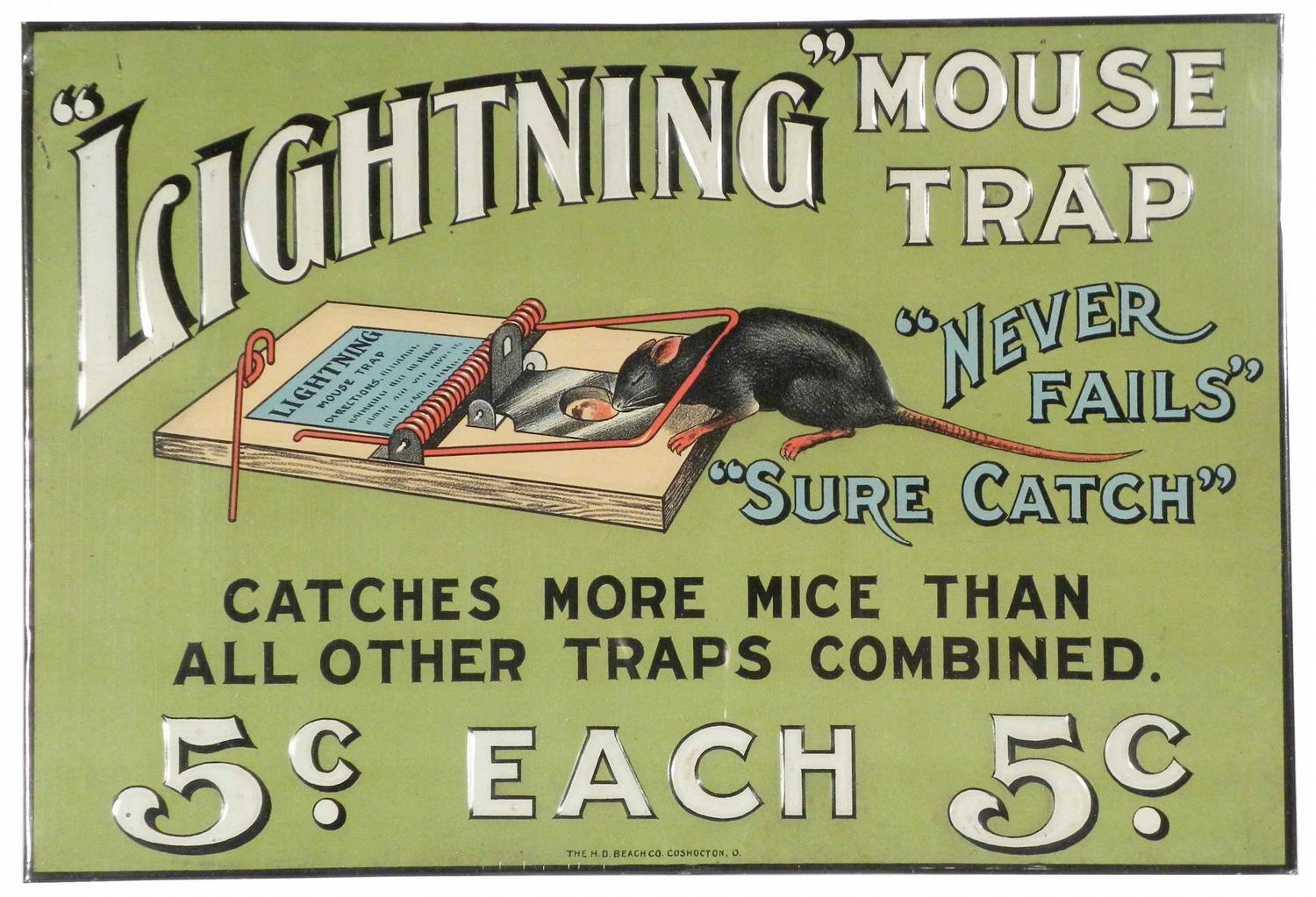 Rare Lightning Mouse Trap Embossed Tin Over Cardboard Sign. String hanging. The H.D. Beach Co. Coshocton, OH. Outstanding color and graphics. Near mint condition. 9 1/2 X 6 3/8 inches. Starting bid $500