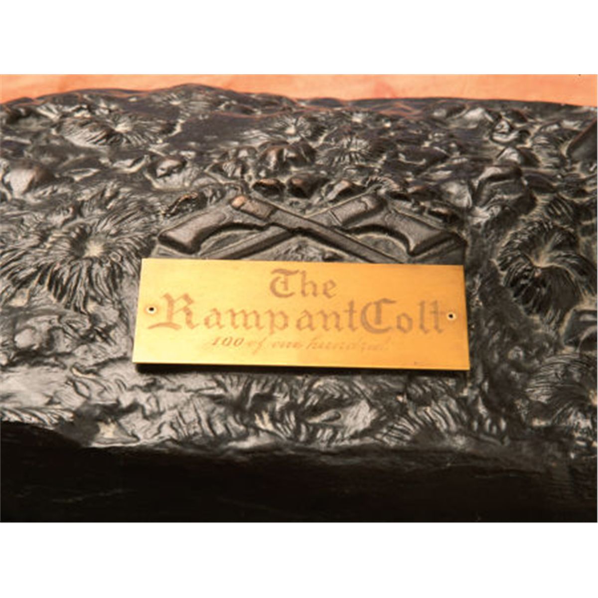 Rare Limited Edition Rampant Colt Bronze Statue #100 of 100 Together with Accompanying Book, The Rampant Colt, by R.L. Wilson. This is number 100 of 100 examples cast in bronze in 1968 from the original Colt lead mold pattern of the Rampant Colt once in the Colt factory, c. 1855. Size: 19-inches high X 21-inches wide. Cast with an integral bronze base, including two crossed Colt Texas Paterson revolvers. Designed by master gunsmith and craftsman Thomas Haas, the complete sculpture is mounted on an ovoid green marble plinth with brass escutcheon reading: The Rampant Colt/#100 of One Hundred. Sold together with a highly illustrated hard copy of The Rampant Colt by R.L. Wilson. This book documents the history and use of the iconic Rampant Colt and its importance in the history of Colt firearms. The ultimate accessory for any Colt collector. Provenance: Wallace Beinfeld/ Buddy Hackett Condition: Excellent with light age wear present. Lances in mouth and right leg are not present. Consignor reports he will provide a set to buyer.