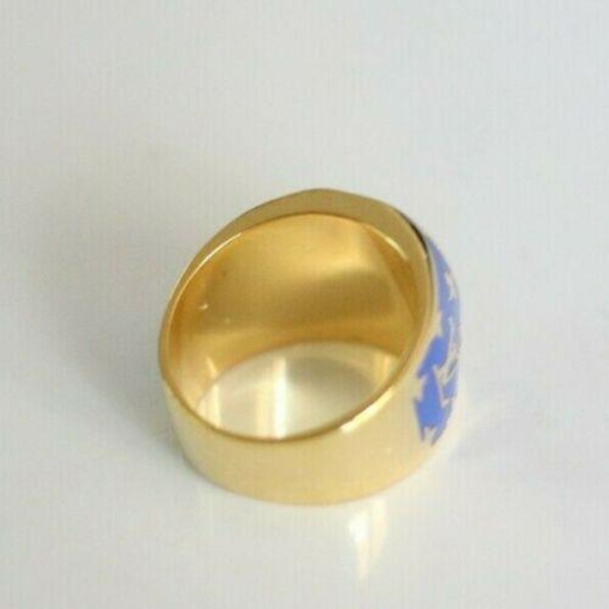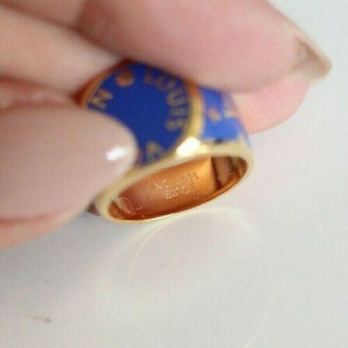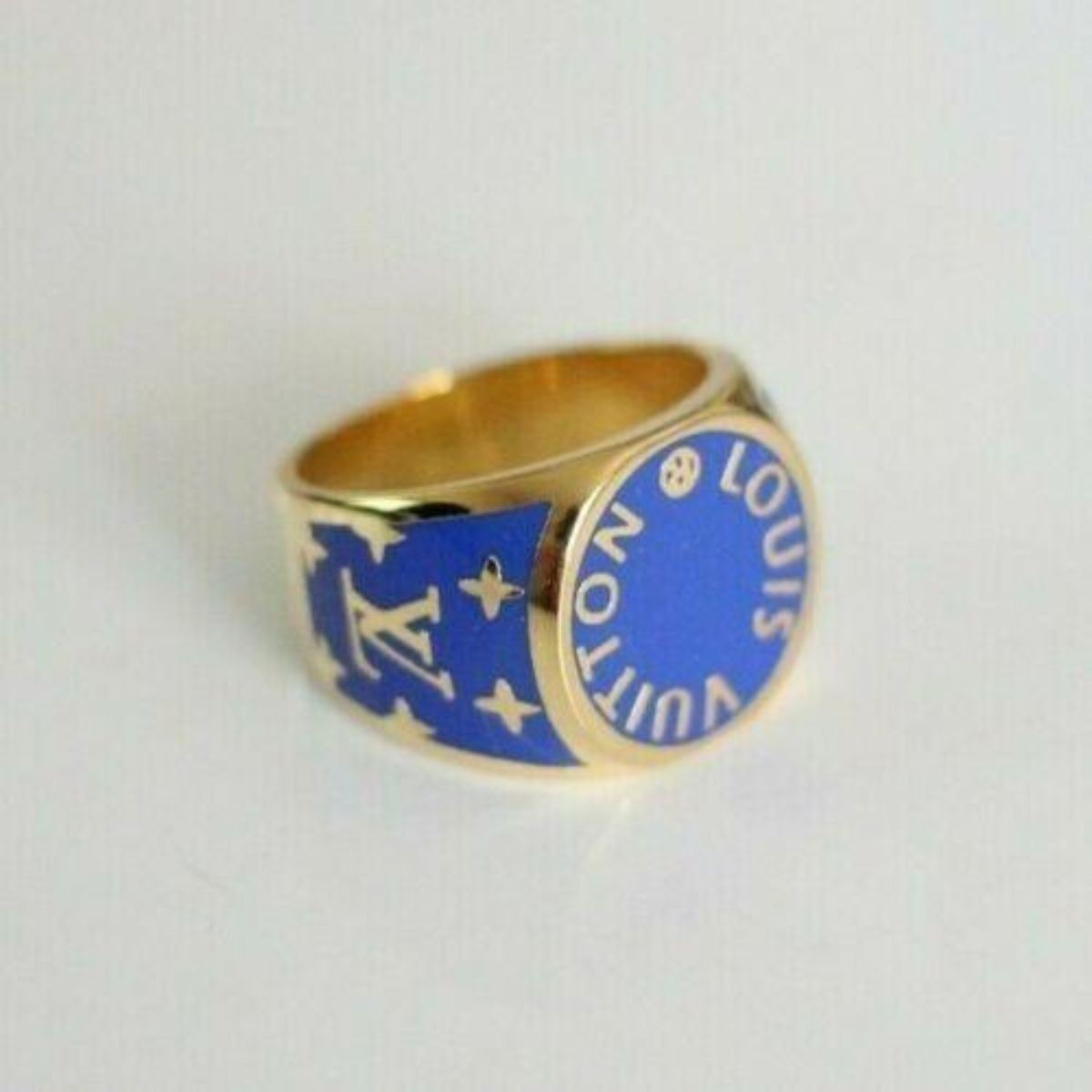 Authentic & rare, out of stock, designer Louis Vuitton LV Colors Signet ring. 24Â kt gold plate royal blue enamel monogram logo ring. Stamped LOUIS VUITTON on inside. Size 7.