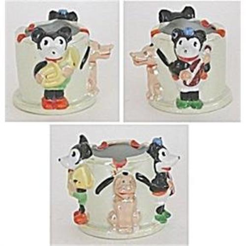 Rare lusterware ashtray or pencil cup featuring three Disney characters in bas relief, Mickey Mouse, Minnie Mouse, and Pluto the Pup, 2-1/2" tall, marked on bottom "Made in Japan," excellent condition except for barely perceptible very minor rim chip on inside of edge of ashtray and not affected figures. Photo shows all three characters.<BR>