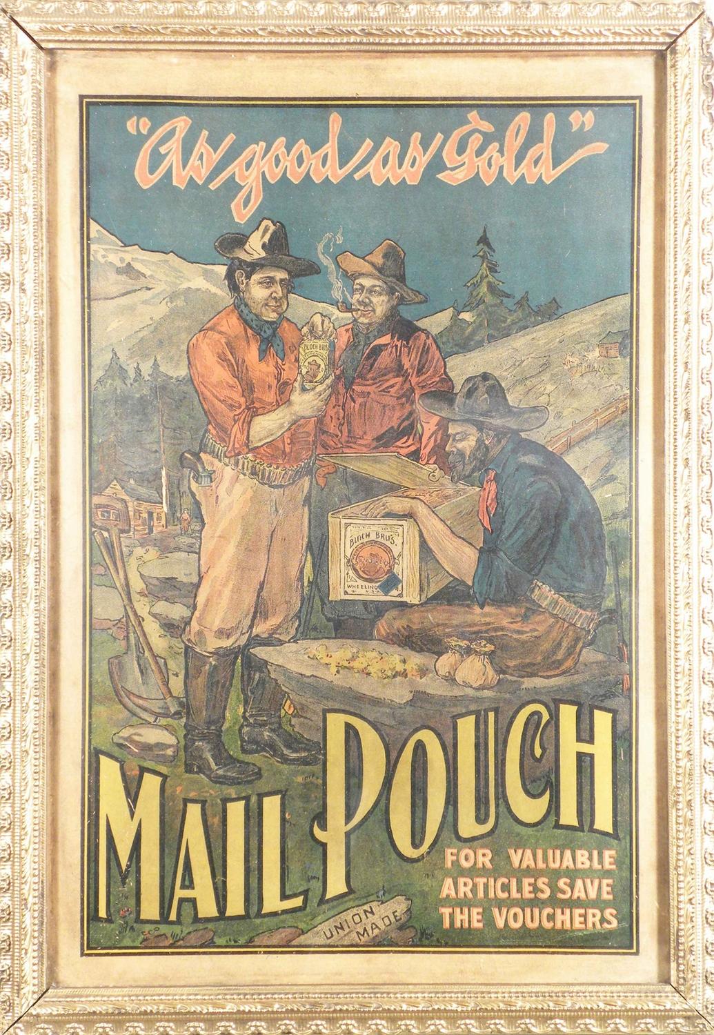 Rare Mail Pouch Tobacco Cardboard Sign. Entitled, "As Good As Gold". Bloch Bros. Wheeling, W. Virginia. The only one we have ever seen. Framed under glass. Some smoke discoloration and scratch at 5:00 otherwise very good condition. 12 1/2 X 19 inches image only.