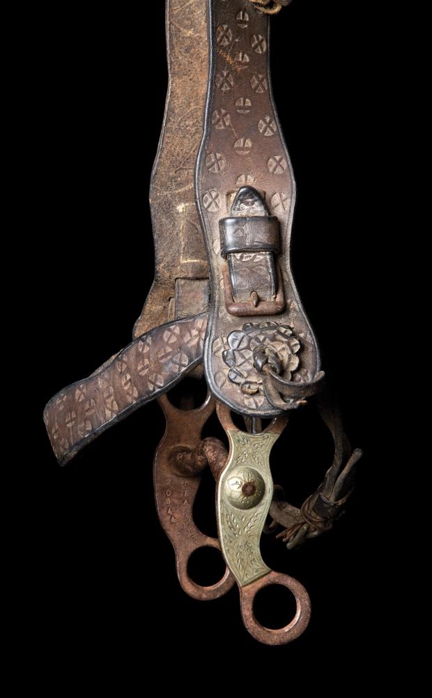Colorado Penitentiary made German silver overlaid curb bit stamped with prisoner No. 20344 and Deaf Mute inside the cheek. According to Patrice Maul and Jack Ferguson’s Colorado Prison Spurs, this was the maker-mark of E.H. McKinney who served 161/2 years in Canon City prison from 1938-1954 for the assault and attempted rape of two young school teachers. The account of the incident leading up to McKinney’s incarceration is well detailed in the Maul & Ferguson book for those who care to read further. The bit is in fine overall condition, attached to a leather headstall.