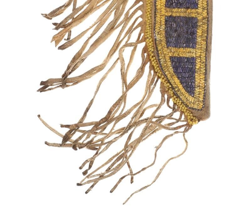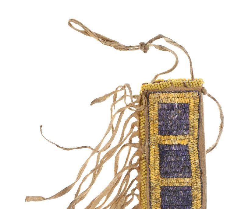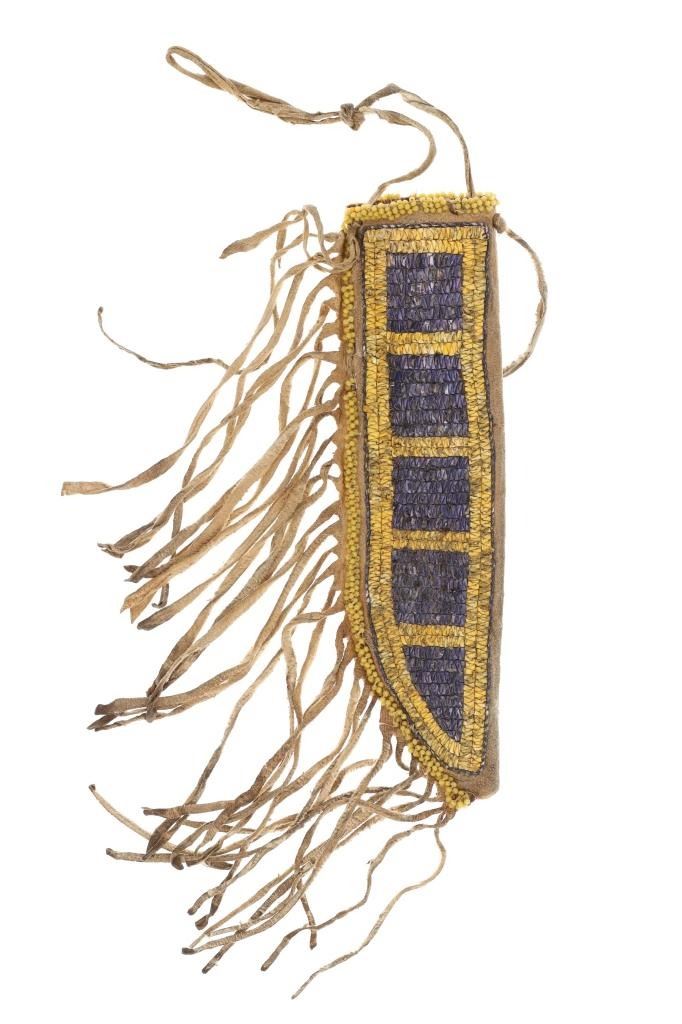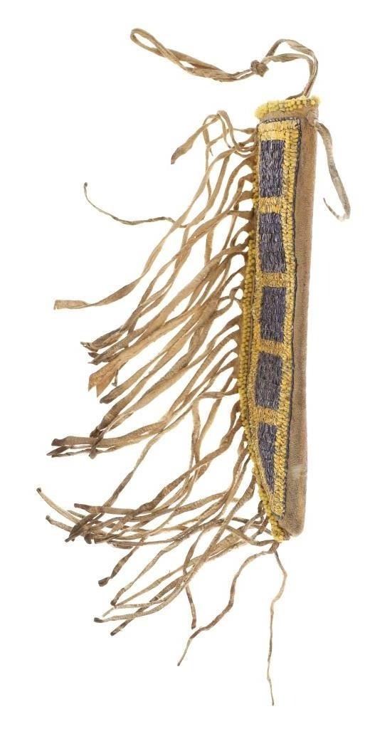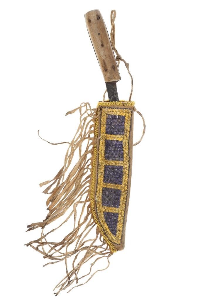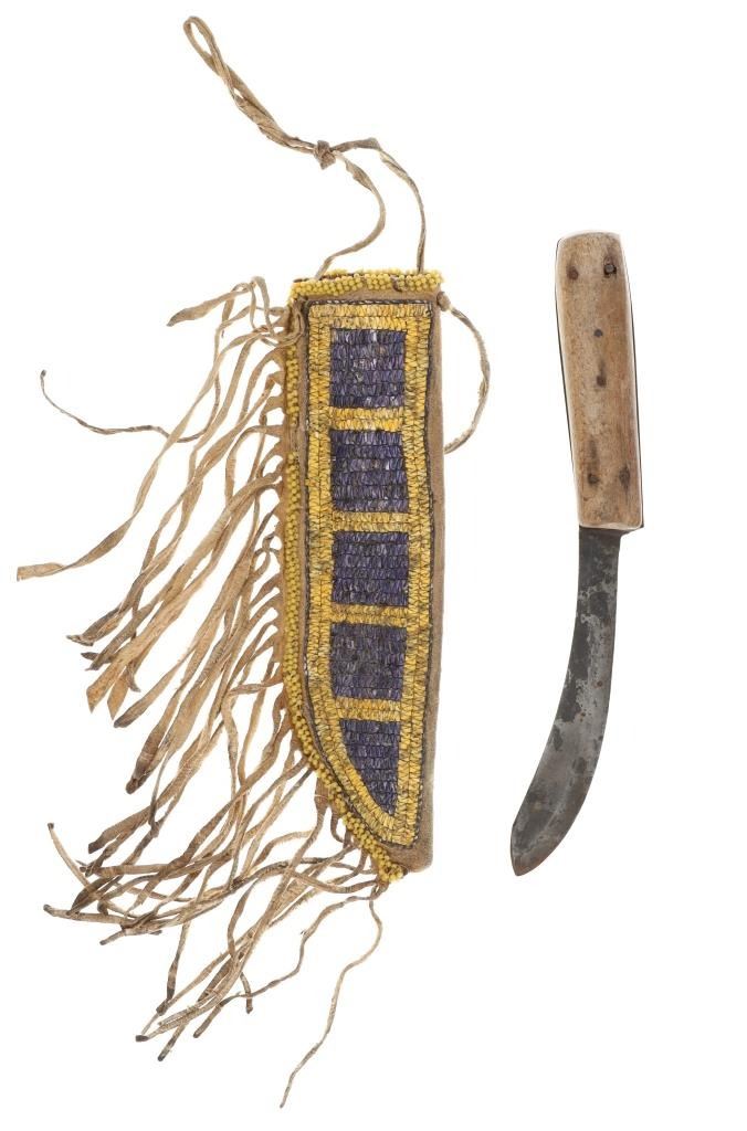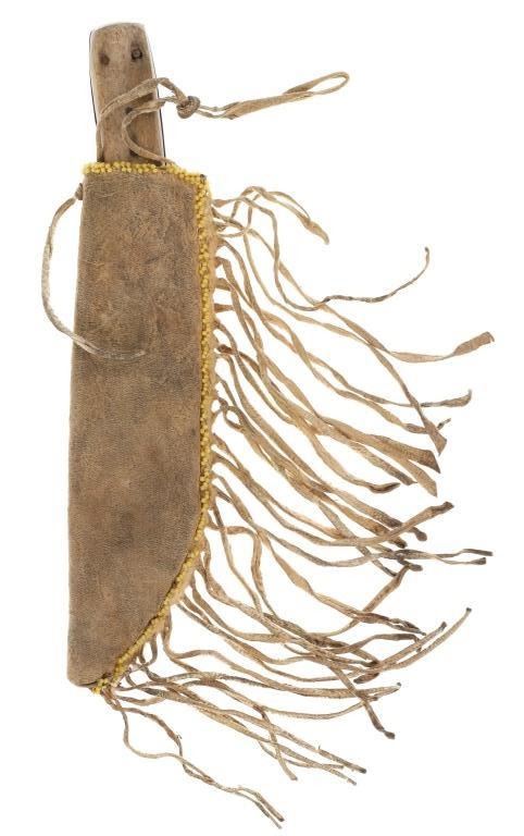 This is a rare Mandan fully quilled front and beaded buffalo hide sheath with early trade knife from the early 20th century. The sheath is comprised of Indian tanned buffalo hide covered on the front with an iconic geometric design documented from the Mandan, Hidatsa, and Arikara tribes done in porcupine quill quillwork. The quillwork shows natural mineral pigment dyes of yellow and violet purple showing five square tabs. The top opening and outside edge are fancy beaded with early 1900s glass trade seed beads in greasy yellow, sewn with trade thread. The outside edge has Indian tanned hide long fringes and belt tie. The knife is a nice antique skinner with blacksmith forged blade having a single beveled edge and two-piece hardwood handle held in place with iron pins. For other Mandan examples see the Mandan beaded and quilled sheath offered by Heritage in October 2022 for $1,500-$2,500 which shows the same graduate square tab design and the yellow and violet quilled sheath from Fort Berthold of the Mandan, Hidatsa, and Arikara tribes sold by Cowans in 2012 for $2,600. Provenance: From a private Wisconsin collection. Measures overall 19.5” with belt tie and fringes by 8.5”W with fringes and 2.5”W without. Knife is 9.75”L.*