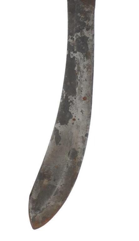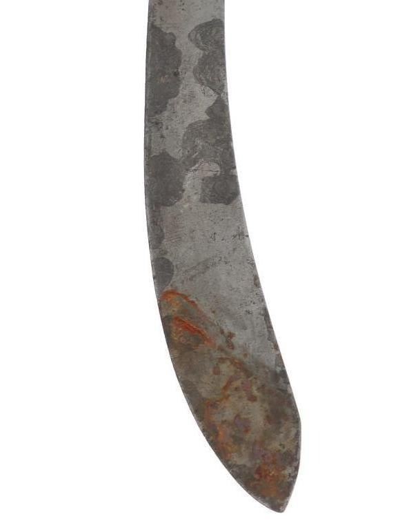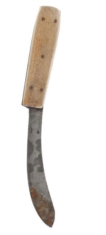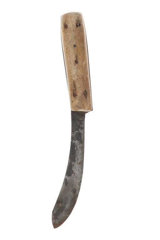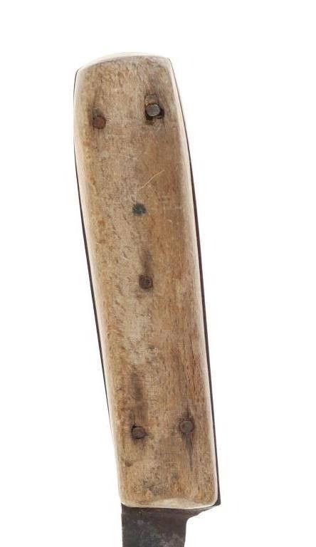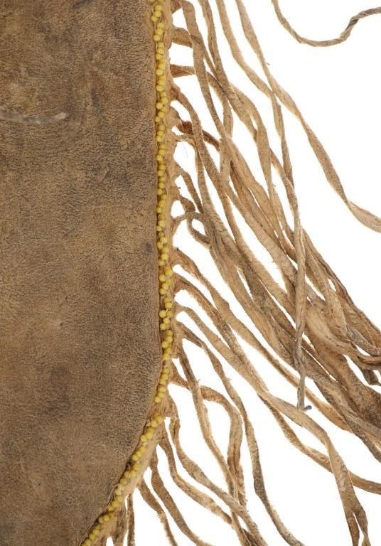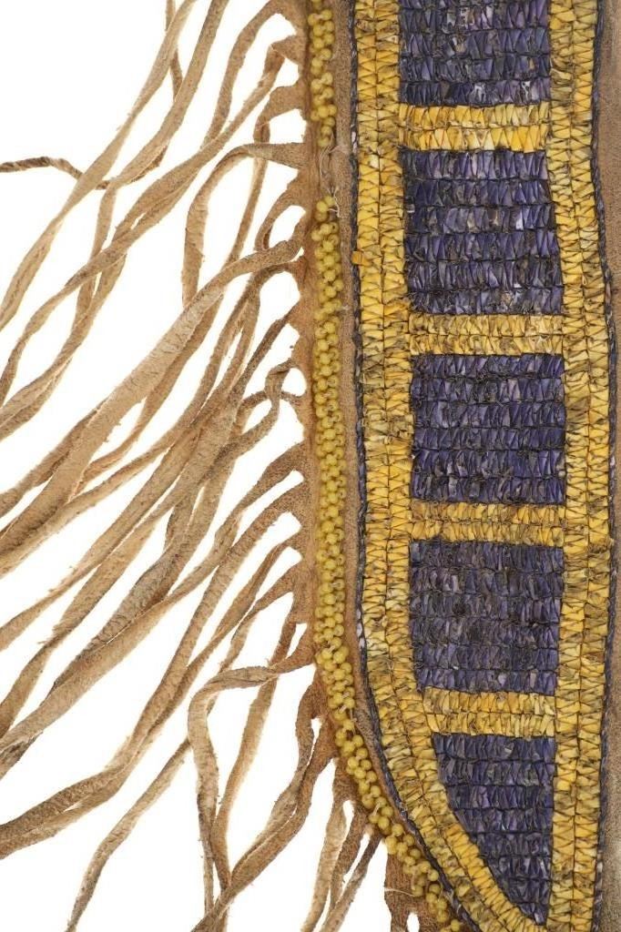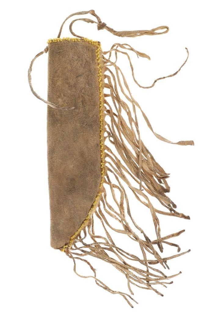 This is a rare Mandan fully quilled front and beaded buffalo hide sheath with early trade knife from the early 20th century. The sheath is comprised of Indian tanned buffalo hide covered on the front with an iconic geometric design documented from the Mandan, Hidatsa, and Arikara tribes done in porcupine quill quillwork. The quillwork shows natural mineral pigment dyes of yellow and violet purple showing five square tabs. The top opening and outside edge are fancy beaded with early 1900s glass trade seed beads in greasy yellow, sewn with trade thread. The outside edge has Indian tanned hide long fringes and belt tie. The knife is a nice antique skinner with blacksmith forged blade having a single beveled edge and two-piece hardwood handle held in place with iron pins. For other Mandan examples see the Mandan beaded and quilled sheath offered by Heritage in October 2022 for $1,500-$2,500 which shows the same graduate square tab design and the yellow and violet quilled sheath from Fort Berthold of the Mandan, Hidatsa, and Arikara tribes sold by Cowans in 2012 for $2,600. Provenance: From a private Wisconsin collection. Measures overall 19.5” with belt tie and fringes by 8.5”W with fringes and 2.5”W without. Knife is 9.75”L.*