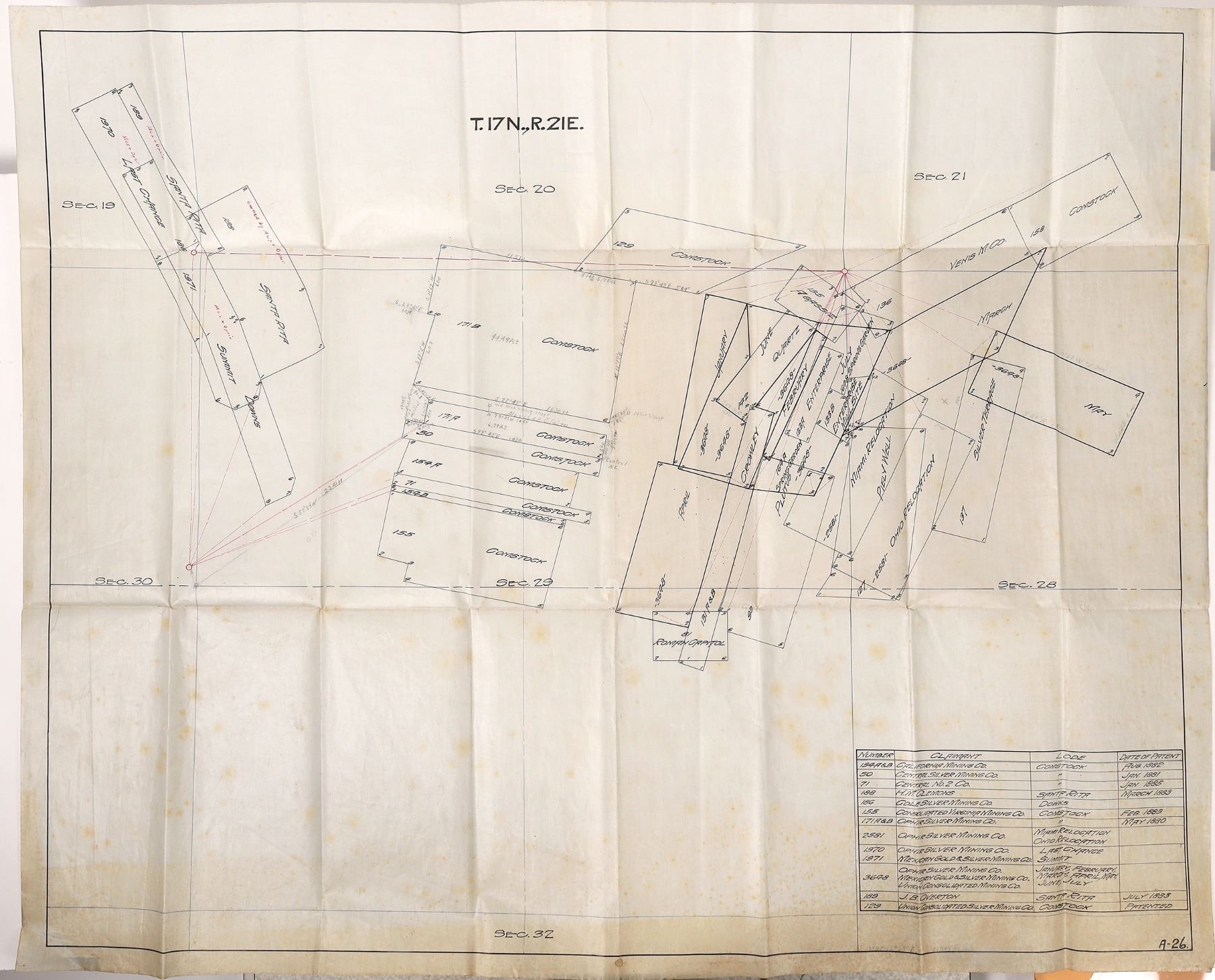 Undated map on vellum that shows claims patented by the California MC, Con. Virginia, Ophir, JB Overton, Union Consolidated, Mexican, and Central Silver MC. Claims include the Santa Rita, Silver Terrace, Comstock, Last Chance, Summit, Enterprise, and more. Patent dates listed on the side (1880s). Handwritten pencil notations added to the map. 26 x 31.5" No mapmaker or date given. Rare. Virginia City Nevada