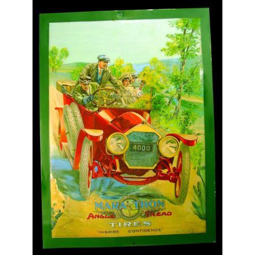 Marathon Angle Tread Tires Beveled Tin over Cardboard Sign, 1915, Extremely Rare and desirable. The Marathon Tire and Rubber Co., some professional restoration however, this sign displays very well and has fabulous graphics and color. 17 x 23 inches.