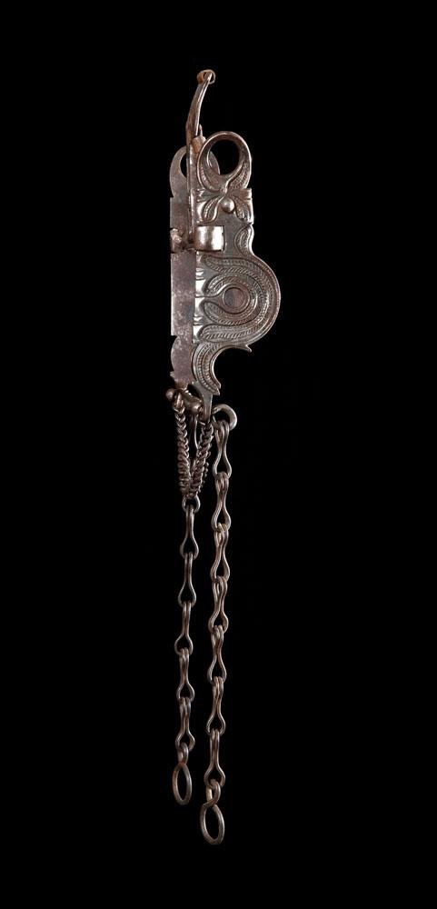 Scroll chasing in long leaf pattern, 4 1/2” bar, double slobber chain, excellent condition, possibly unused.