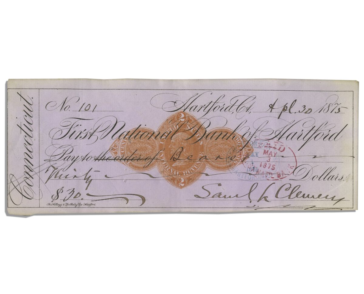 Literary giant Mark Twain personal check signed ''Samuel L. Clemens'' clearly in black ink. Around the time Clemens signs this check, he was completing his most famous work, ''The Adventures of Tom Sawyer'', published in 1876. Dated and filled out in Clemens' hand, the First National Bank of Hartford, Connecticut check is numbered ''101'', dated ''Apl. 30 1875'' and made out to ''Bearer'' for the sum of $30. With two ''Paid'' stamps in red and blue ink to front of check and an additional stamp to verso. Measures 7.5'' x 3''. Slightly uneven bottom edge and a few tiny pinholes, else near fine.
