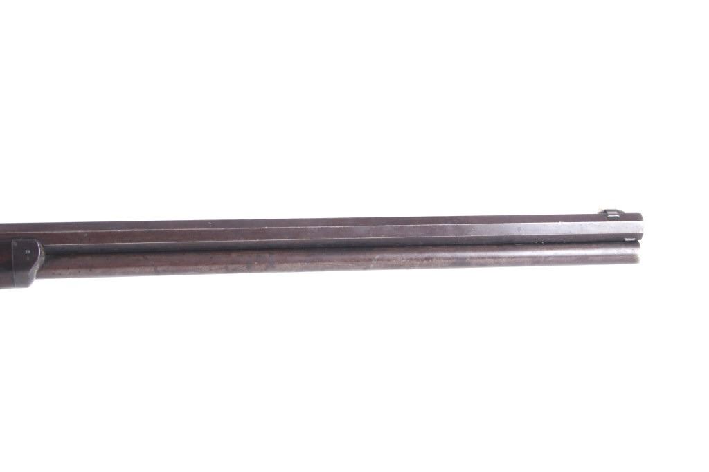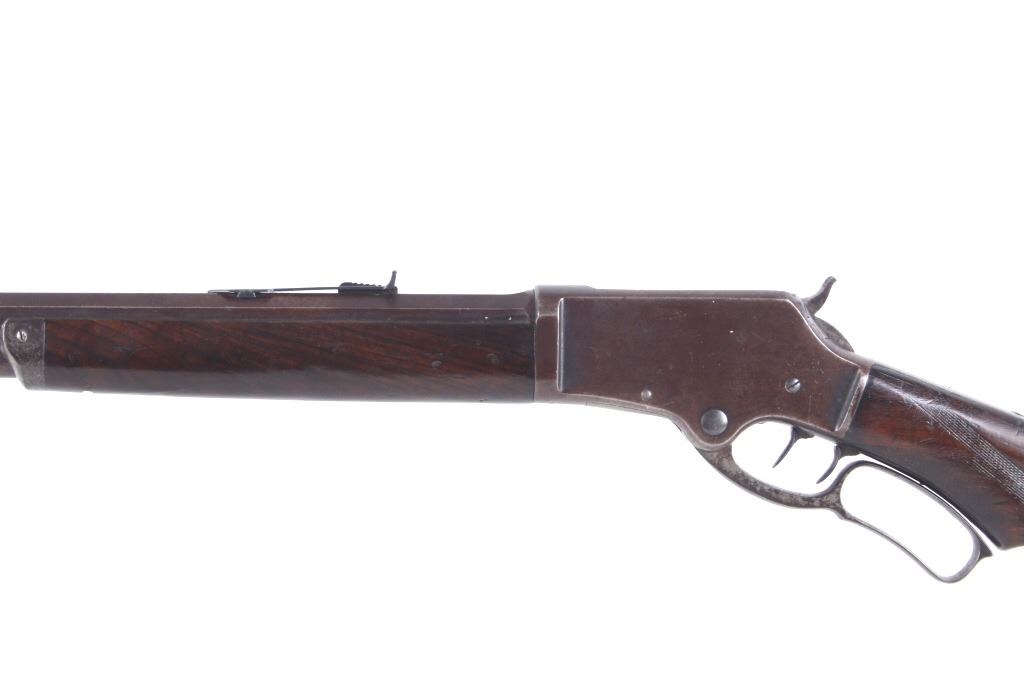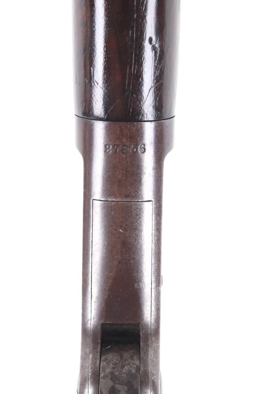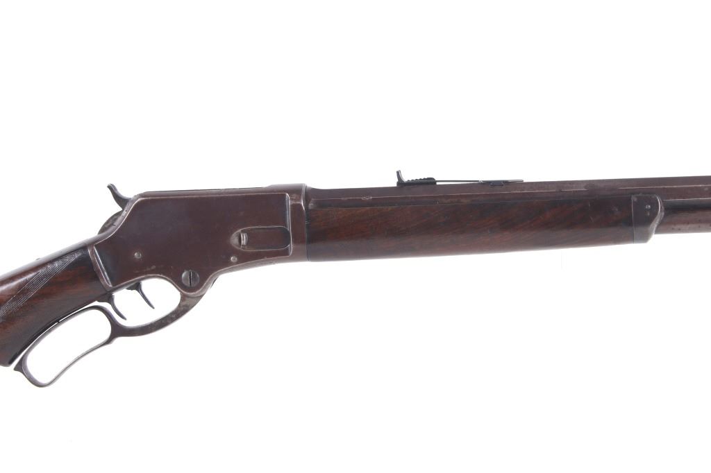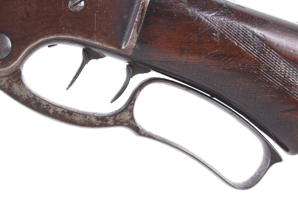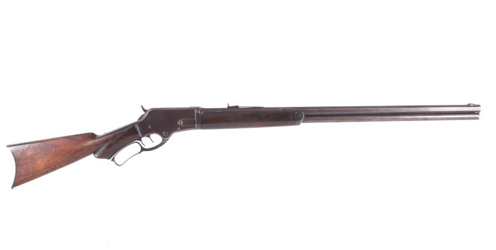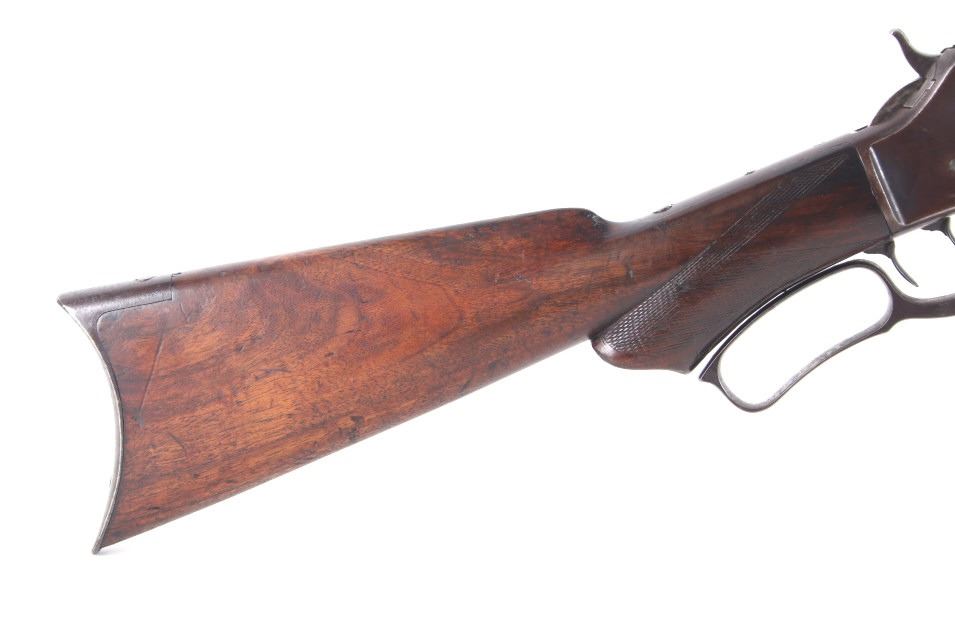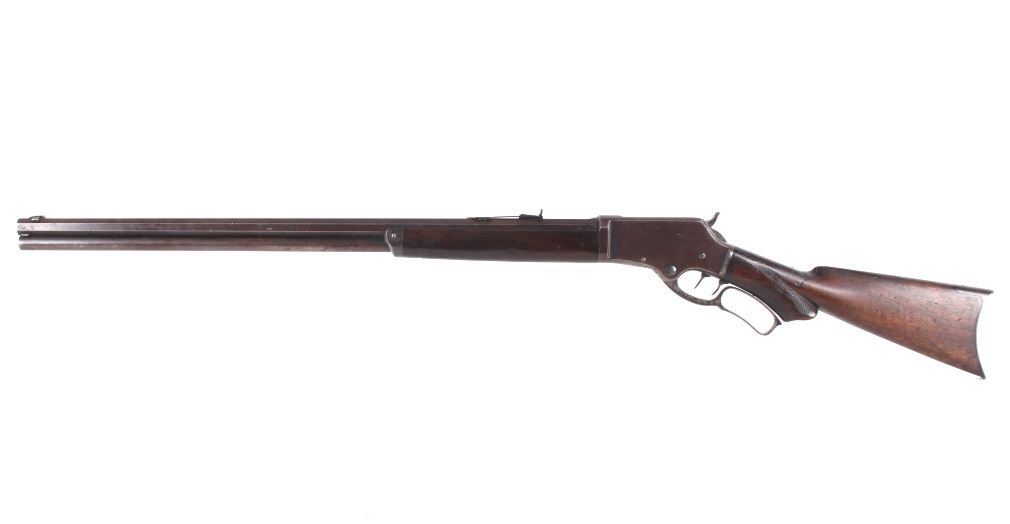 Exceptionally rare Marlin Model 1881 full deluxe octagon rifle made in 1889. The Model 1881 was Marlin’s first lever action rifle and was revolutionary for the time because it could fire the .45 Government round (.45-70) and the .40-60 Marlin caliber, which was simply a .45-70 case tapered to hold a .40 caliber bullet (Winchester copied this cartridge and called it the .40-65 Winchester). Exceptionally smooth functioning and reliability made this a very popular rifle for its time. Because it fired large, powerful rounds, it was especially well suited to western frontier use. This example with serial number 27856 was a special order rifle. It was made with a checkered pistol grip butt stock and forearm. Additionally, it was ordered with double set triggers that are normally found only on precision