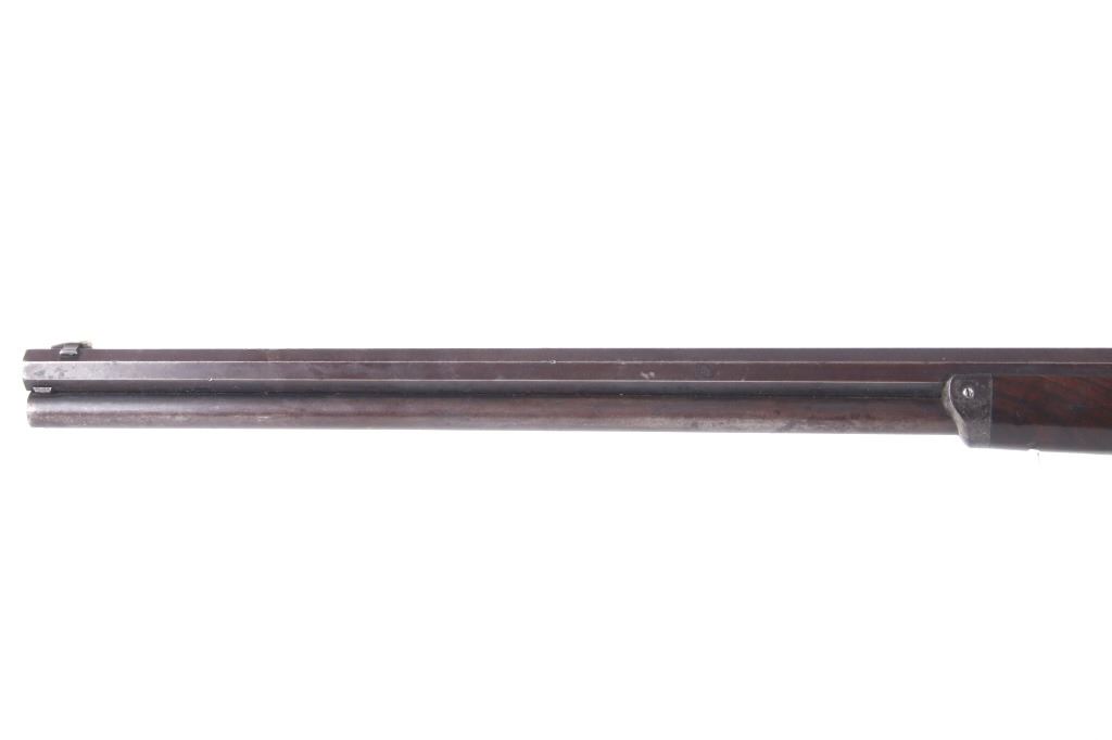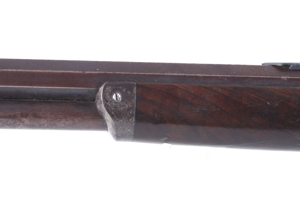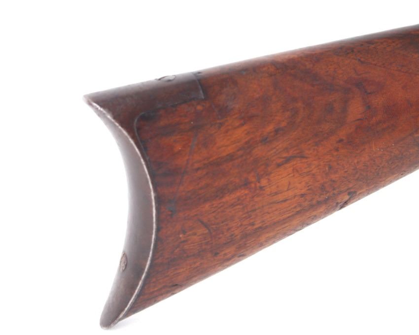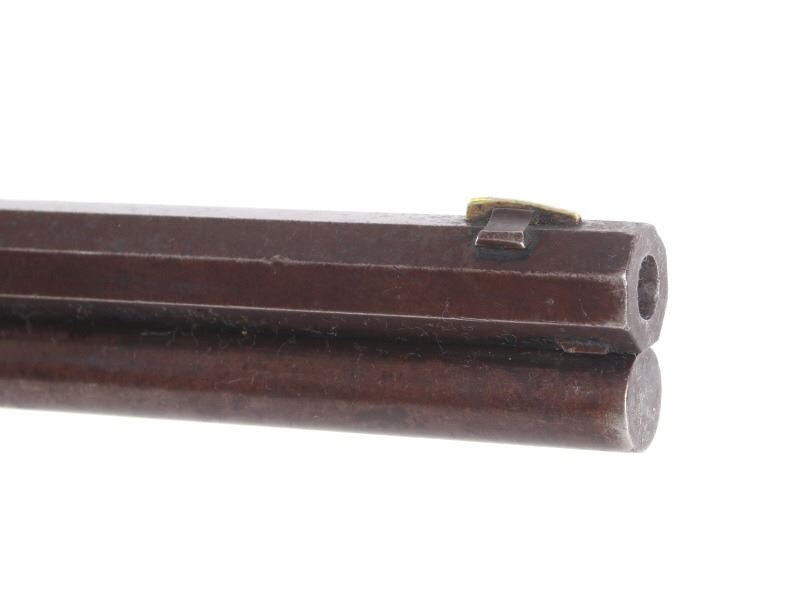 is usual for this model, and can fairly easily be replaced or simply left as is. The 28” octagon barrel and full magazine also show a fine uncleaned aged blue to brown patina with the barrel retaining all the original fine Marlin markings and patent dates. The buckhorn rear sight with elevator bar remains intact and the Rocky Mountain blade front sight appear original and correct for this model- frequently rifles of this age are encountered with altered or changed sights. The double set triggers are a special order option rarely found on this, or any Marlin model, and they function perfectly. The triggers help in precise shooting by pulling the rear trigger until it “clicks” or sets. Then minimal pressure on the front or “hair” trigger releases the hammer and fires the rifle. When encountered, double set triggers on rifles of this age are rarely still functional. Also amazingly, the bore condition of this 134 year old rifle would rate excellent with sharp rifling from breech to muzzle and no appreciable pitting whatsoever. The