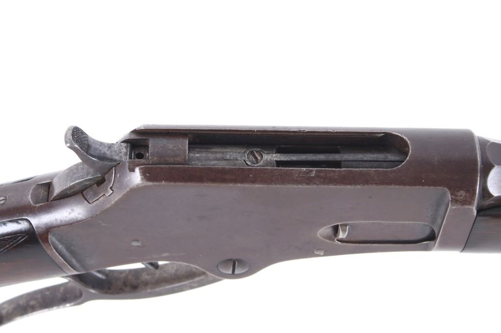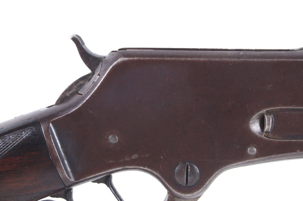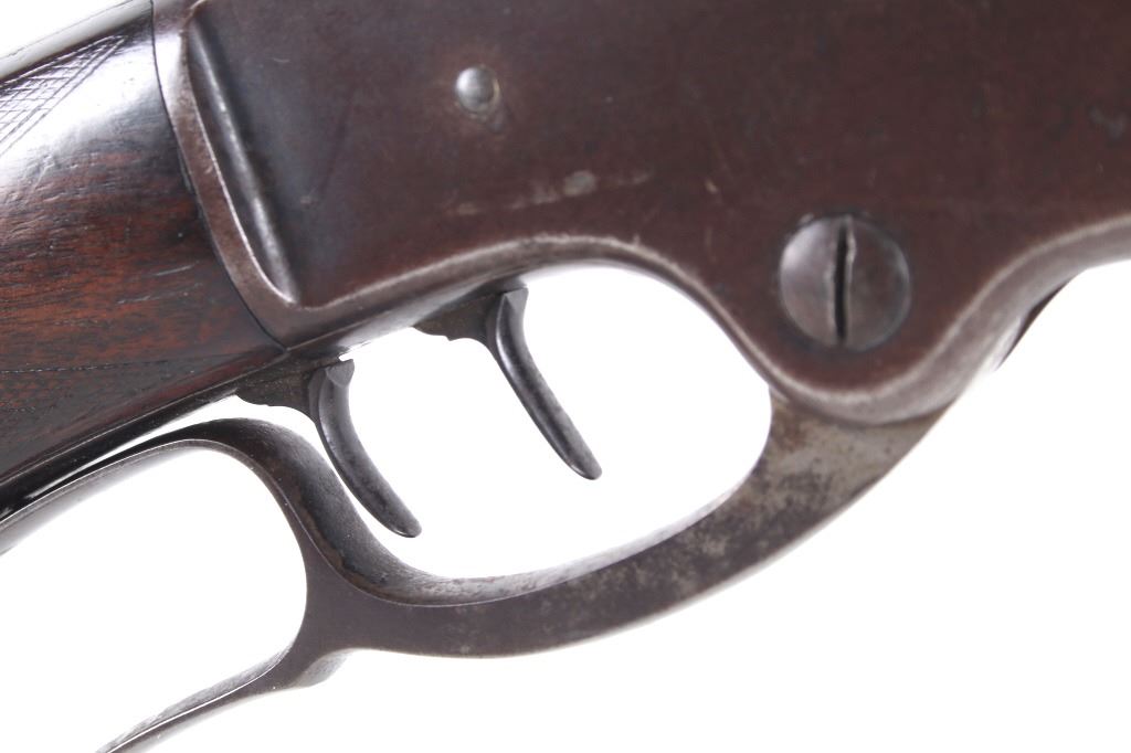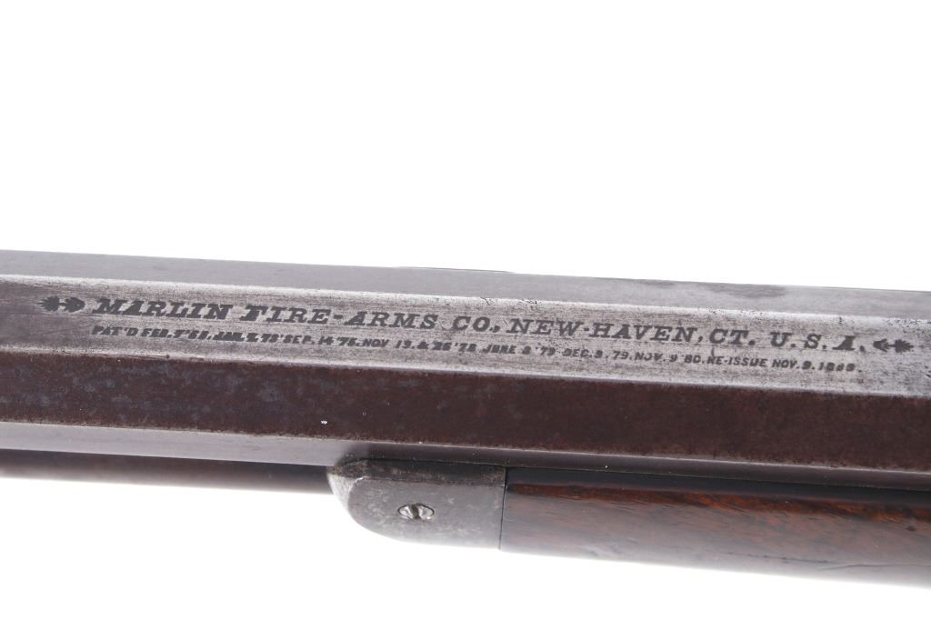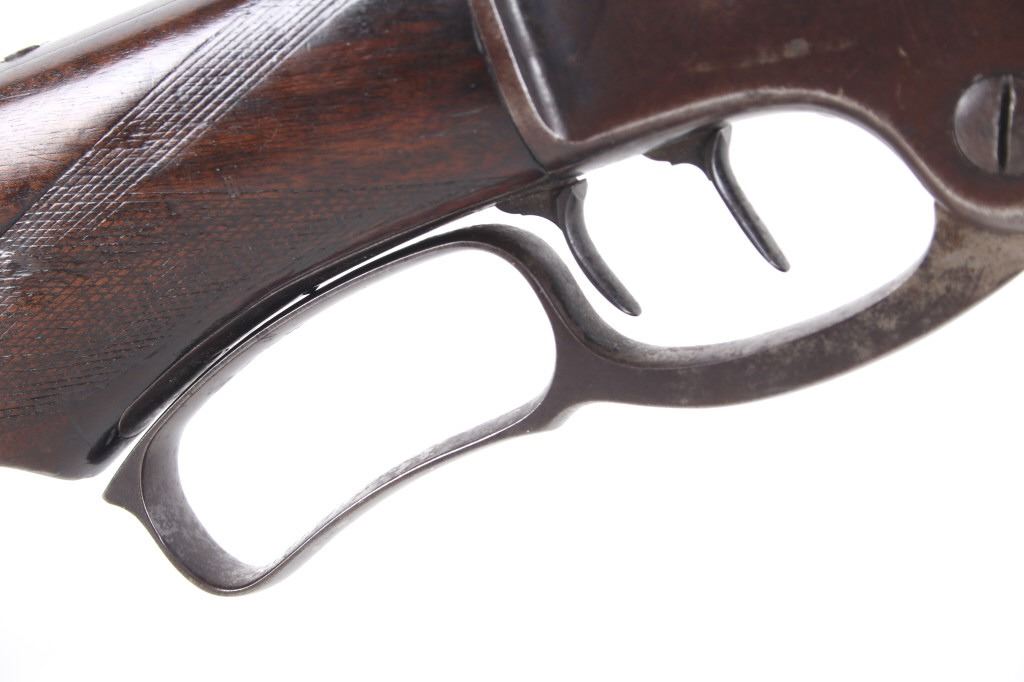power cartridge that until the Model 1881 could only be had in a single shot firearm. The land west of the Mississippi River was still lawless and game rich at the same time. A hunter or lawman armed with a Model 1881 had a great advantage over nearly everyone else at the time. Any Marlin Model 1881 is a scarce and desirable big lever action collectible rifle. Finding one of the few manufactured with a checkered pistol grip and forearm along with functioning double set triggers is a rarity in itself. An unusual opportunity to acquire one of the first big bore repeating rifles of the Wild West and one with very rare and desirable features. Serial Number: 27856. This firearm qualifies as an Antique, and does not require FFL Transfer or NICS Background Check.