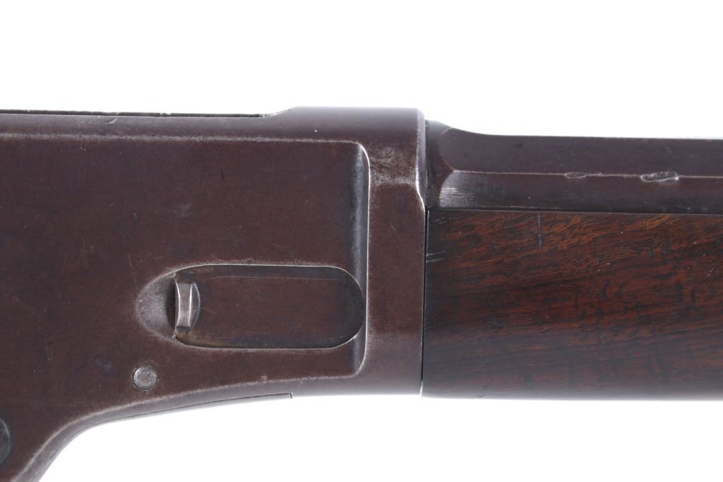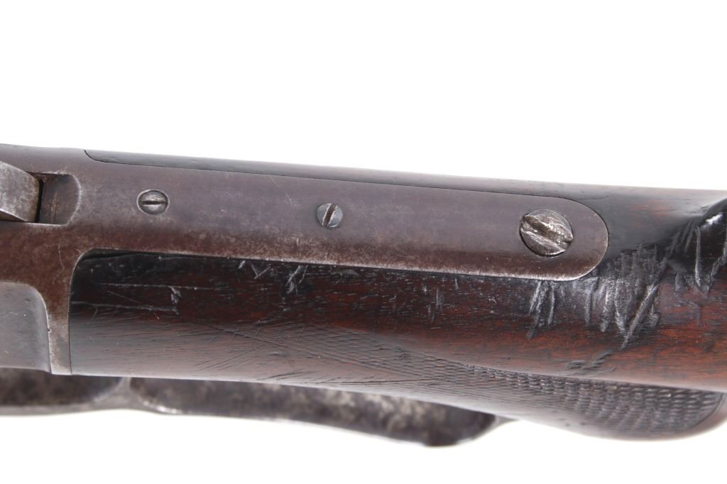 single shot rifles of the period and rarely encountered on any lever action repeating rifle. This one is chambered in .40-60 Marlin caliber (.40-65 Win.). Overall it is in the wonderful uncleaned and unaltered “attic condition” that collectors appreciate. Most of the Model 1881 Marlin rifles saw very hard service under difficult conditions and when encountered today reflect this in their often poor states of preservation. This rifle shows normal frontier usage, but retains a solid walnut stock and forend with no signs of cracking or chipping. The wood to metal fit is very tight indicating that the stock and forend have never been refinished or sanded in any way. The receiver blue has evenly aged to a deep aged plum patina and retains the sliding loading gate. Only the dust cover on the receiver top is missing, as