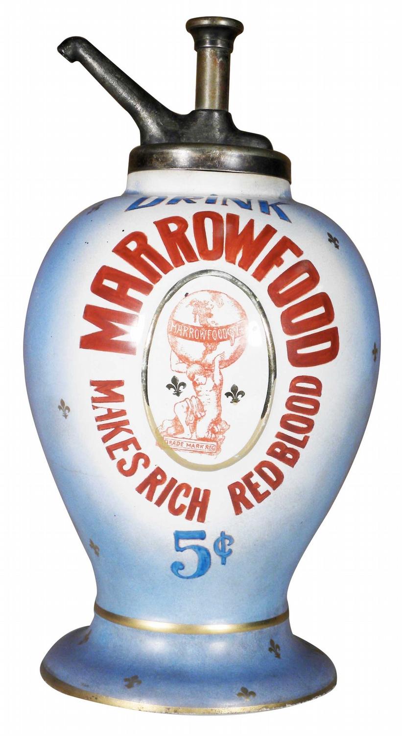 Rare Marrowfood Syrup Dispenser 5 Cent. Pump not original. Property of Christo Mfg. Co. Richmond, VA. No chips or cracks, excellent condition. 8 inch diameter X 15 inches tall.