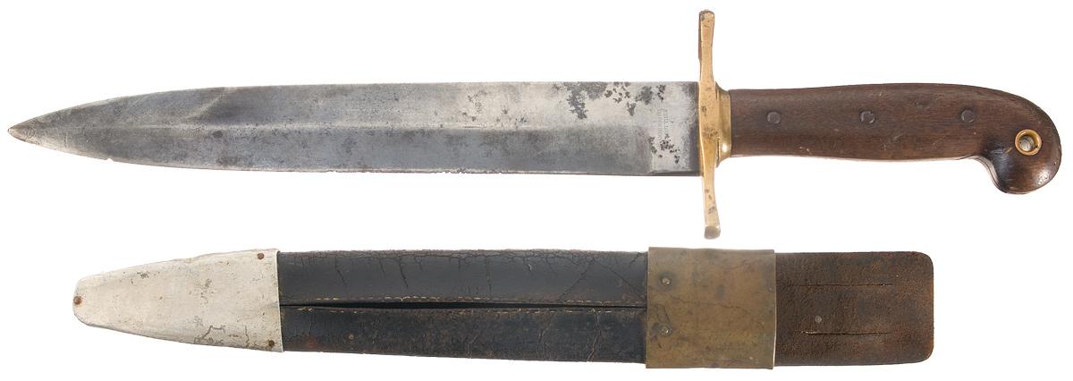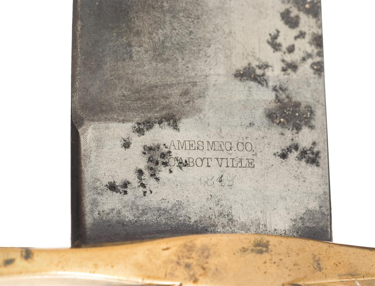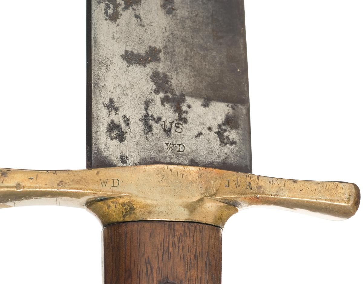 This massive fighting knife has an 11 3/4 inch spear point blade and a nearly 4 inch long brass cross-guard. Fitted with slab-sided walnut grips secured by three steel rivets. The top of the grip has a brass lined hole for a wrist thong. The obverse ricasso is stamped with the "U.S." property mark over the ordnance inspector's initials "WD". The reverse ricasso is stamped "AMES MFG.CO./CABOTVILLE/1849". The obverse cross-guard is stamped with the inspectors and sub inspector's initials "W.D." and "J.W.R.". The knife is complete with a black leather scabbard with brass throat and an old (but still mid-20th century) replacement metal tip (marked "Juice / Sealdsweet / EXTRACTOR"). (The aforementioned "field repair" was most likely war performed by the consignor's father whom actually carried and used the knife; obviously not a collector!) The brass attachment stud on the throat is stamped with the inspector mark "D".