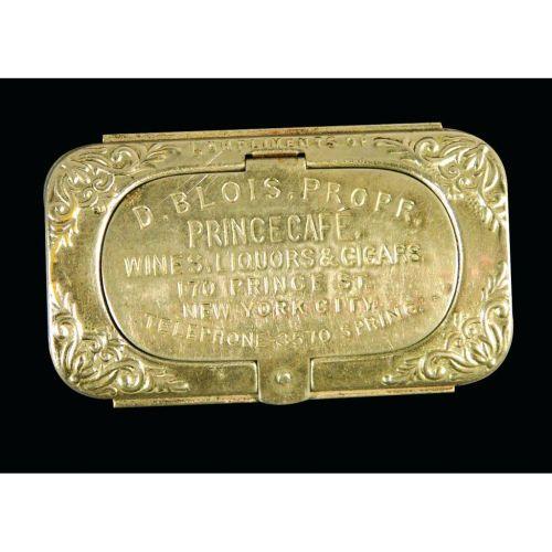 Rare Match Safe and stamp holder for the Prince Cafe D. Blois, Proprietor Wines, Liquors and Cigars, NY City. Match holder. Silver Plated, excellent condition. 2 3/4 x 1 5/8 inches.