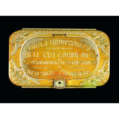 Rare Match Safe and stamp holder for Robert J. Thompson and Co. Wellcut garments. NY City. Match holder. Silver plating is worn, otherwise good condition. 2 3/4 x 1 5/8 inches.