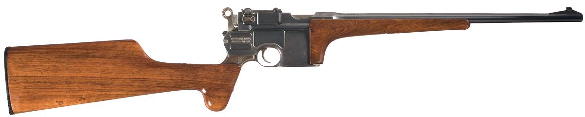 Condition: Excellent. The carbine retains 95% of the original blue finish on the barrel and frame. Wear is limited to some thinning on the finish of the magazine bottom and on contact points on the sides of the frame. Half of the original niter blue finish is present on the extractor, bolt stop and other components. The stock mounting attachment also has about half of the niter blue with the balance a blue gray-patina. Most of the casecolors are present on the hammer and lock frame. All of the markings are crisp. The stock and forearm are both in excellent condition with scattered and very minor handling wear. The stock and forearm retain most of the original varnish finish. This is an excellent example of a rare Mauser Model 1896 Large Ring Hammer Carbine. This carbine would be the centerpiece of any advanced collection of Mauser 1896 Pistols.