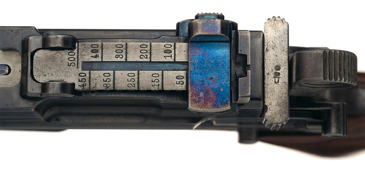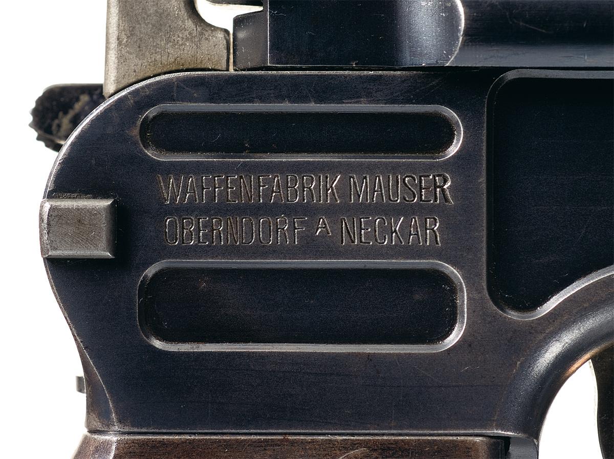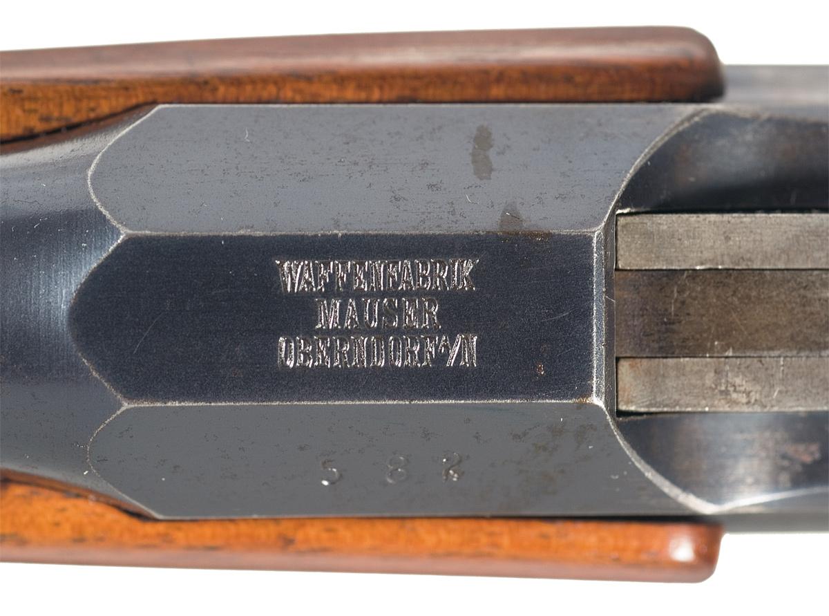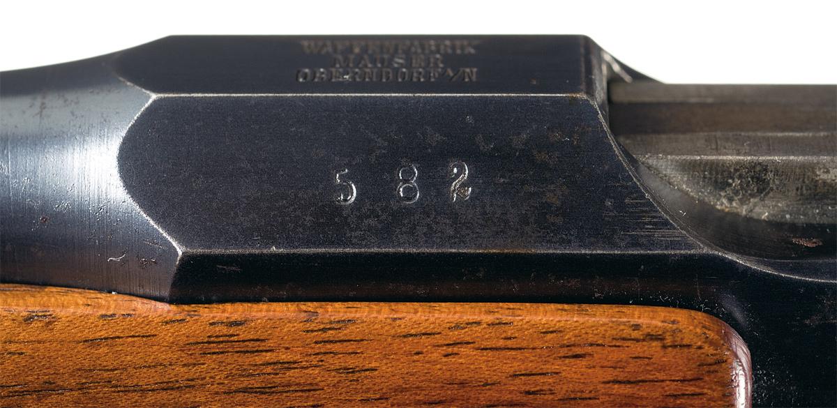 Mauser Model 1896 Carbine with large ring hammer. The carbine has a 14 1/2 inch barrel measured from the chamber to the muzzle. The barrel is fitted with a ramp front sight. The sight has a drift-adjustable blade with nickel-silver bead. The tangent rear sight is marked from 50-500 meters. The magazine has a special extended bottom plate that covers the dovetail where the forearm mounts to the bottom of the frame. The barrel and receiver have a rust blue finish. The bolt is bright. The large ring hammer and lock frame have a casehardened finish. The extractor, rear sight slide, bolt stop, safety lever, trigger and stock mounting attachment are niter blue. The stock and forearm are European walnut with a varnish finish. The stock has a black, checkered hard rubber buttplate embossed with a small Mauser monogram. The top of the chamber is roll-stamped: "WAFFENFABRIK/MAUSER/OBERNDORF A/N" in three lines. The right side of the frame is roll-stamped: "WAFFENFABRIK MAUSER/OBERNDORF A NECKAR" in two lines between the frame panels. The serial number "582" is stamped on the left side of the chamber, the lower left side of the frame, the rear face of the bolt, the top of the bolt stop, the back of the hammer, the back of the lock frame and the left side of the stock attachment mount. All of the visible serial numbers match. The top of the bolt is stamped with a "Double Crown/U" proof mark. Mauser Model 1896 Carbines were produced in very limited numbers; examples are rare.