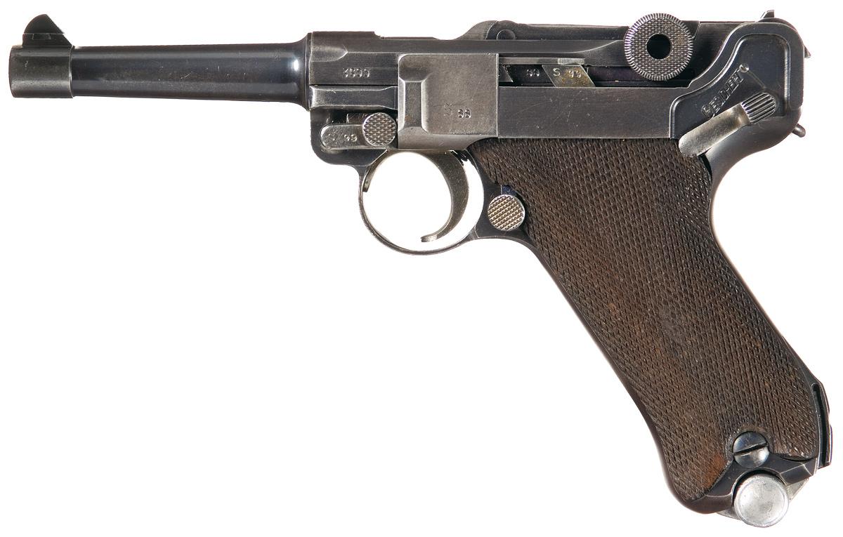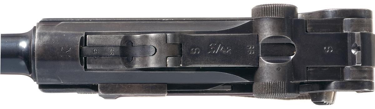 Produced at the Mauser factory in 1934, under the Nazi code system of marking, intended to obscure the extent of German rearmament before the start of open hostilities. Fixed sights, with "K" on the chamber and "S/42" on the toggle. "B 90" proofs on the barrel and faintly on the extension, and S (both block and script) on the extension, frame and other components. Matching numbers on the latch, side plate, safety components, sear, trigger, hold-open, toggle pin, toggle links, extractor, breechblock and firing pin. Checkered walnut grips and nickel magazine with alloy base.