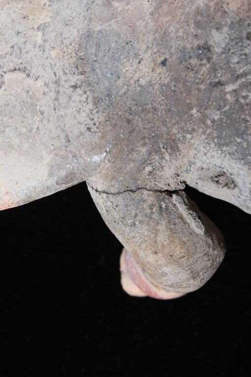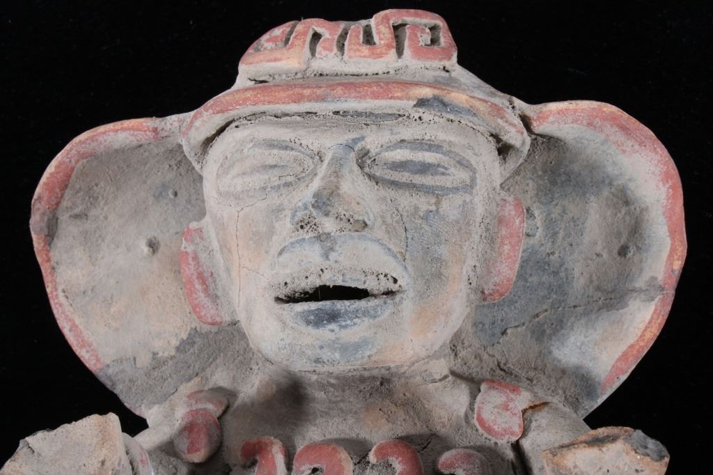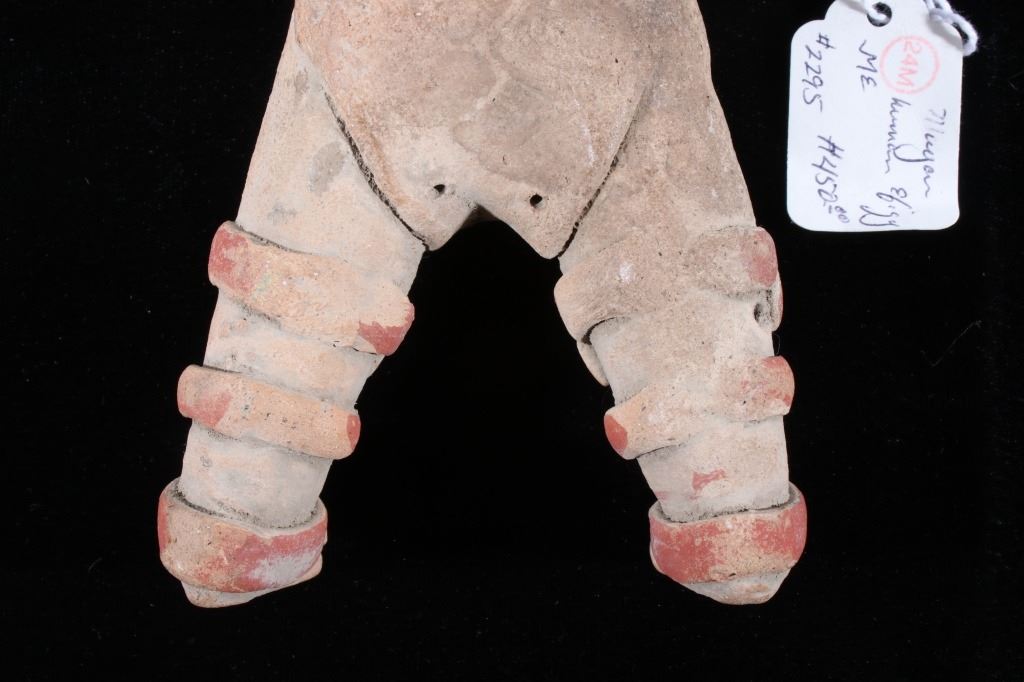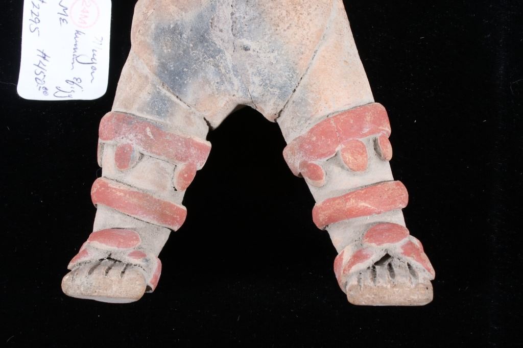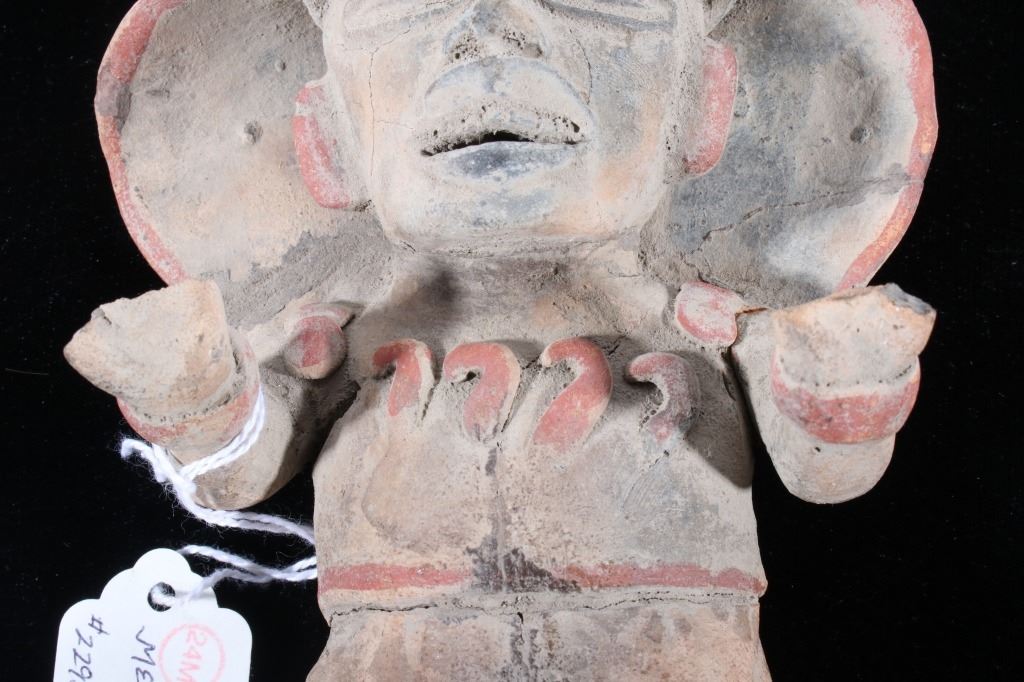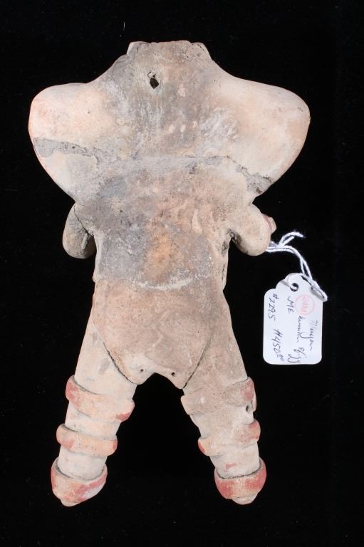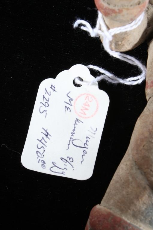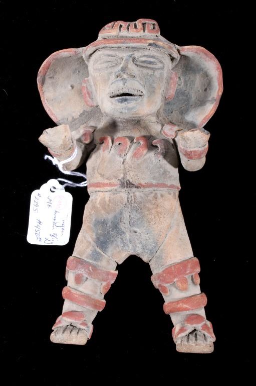 The lot features a Pre-Columbian figural pottery vessel attributed to the Mayan culture and dating to circa 500 A.D. The pottery vessel shows the figural effigy design of a human male or god and shows the original early red pigment on the exterior. The piece has exquisite detail and is in an uncommon form being that the man is standing. The piece still has the tag from Sundog Gallery museum with a 24m ME #2295, presumable the museum identification number, and a price of $450.00. Provenance: From the renowned Sundog Fine Art Bozeman, Montana collection and collected by Bruce VanLandingham. Bruce VanLandingham was a pillar in the American Indian collecting community and a respected expert. Along with being an avid collector Bruce also was the sole owner of Sundog Fine Art Gallery in Bozeman which was both part museum and gallery. Measures 8 inches high by 5 inches wide by 2.5 inches deep. The piece shows some slight breaks and a repaired arm, but overall a fine example for its early age.