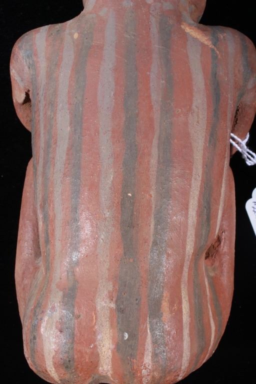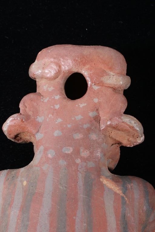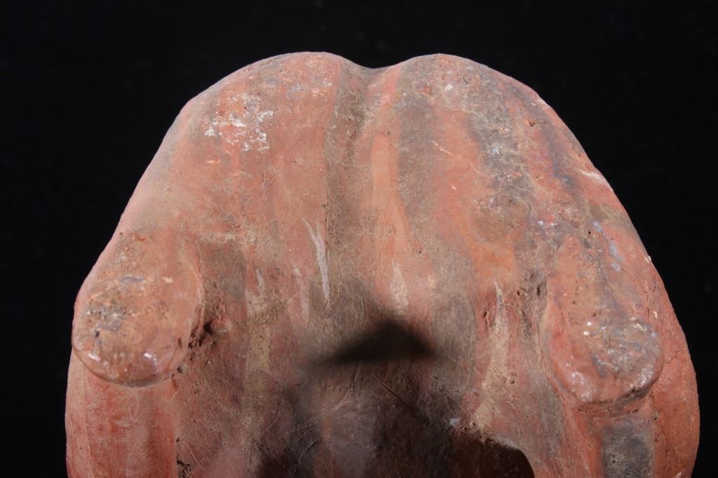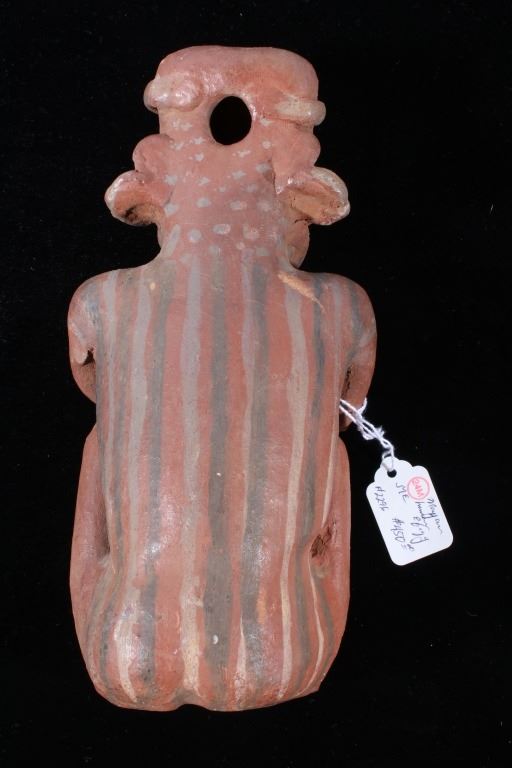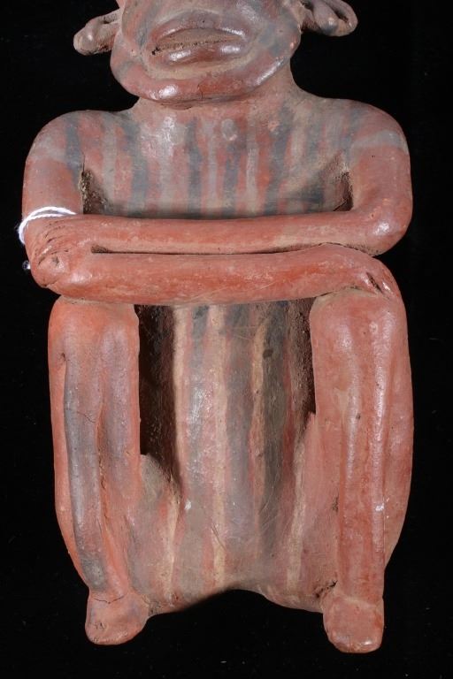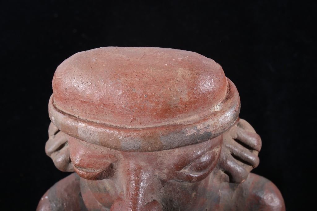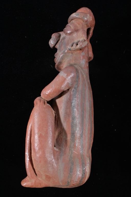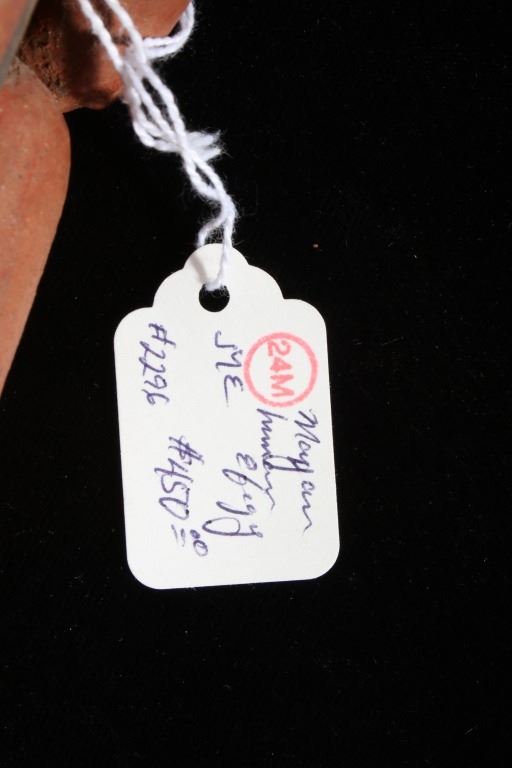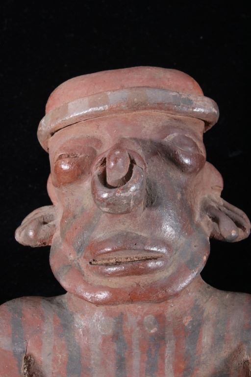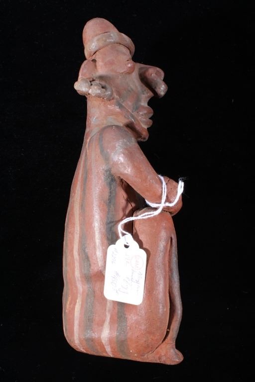 The lot features a Pre-Columbian figural pottery vessel attributed to the Mayan culture and dating to circa 500 A.D. The pottery vessel shows the figural effigy design of a human male or god and shows the original early red and various greys pigment on the exterior. The piece has exquisite detail and large size. The piece still has the tag from Sundog Gallery museum with a 24m ME #2295, presumable the museum identification number, and a price of $450.00. Provenance: From the renowned Sundog Fine Art Bozeman, Montana collection and collected by Bruce VanLandingham. Bruce VanLandingham was a pillar in the American Indian collecting community and a respected expert. Along with being an avid collector Bruce also was the sole owner of Sundog Fine Art Gallery in Bozeman which was both part museum and gallery. Measures 10 inches high by 5 inches wide by 3 5/8 inches deep.