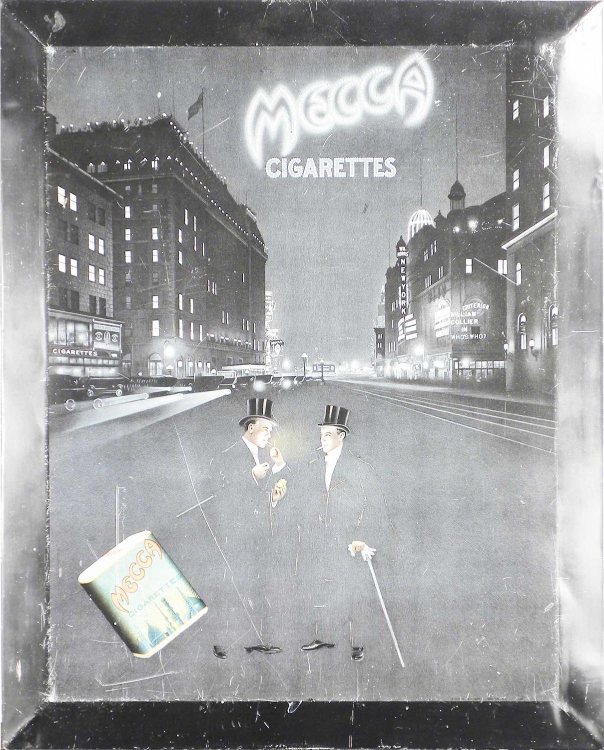 Rare Mecca Cigarettes Tin Over Cardboard Sign. Black and white depiction of Broadway, with the apparition of two gentlemen lighting up. American Litho Company, ca. 1920's. Some touch up, scratches and scuffs otherwise good condition. 16 3/4 X 20 inches.