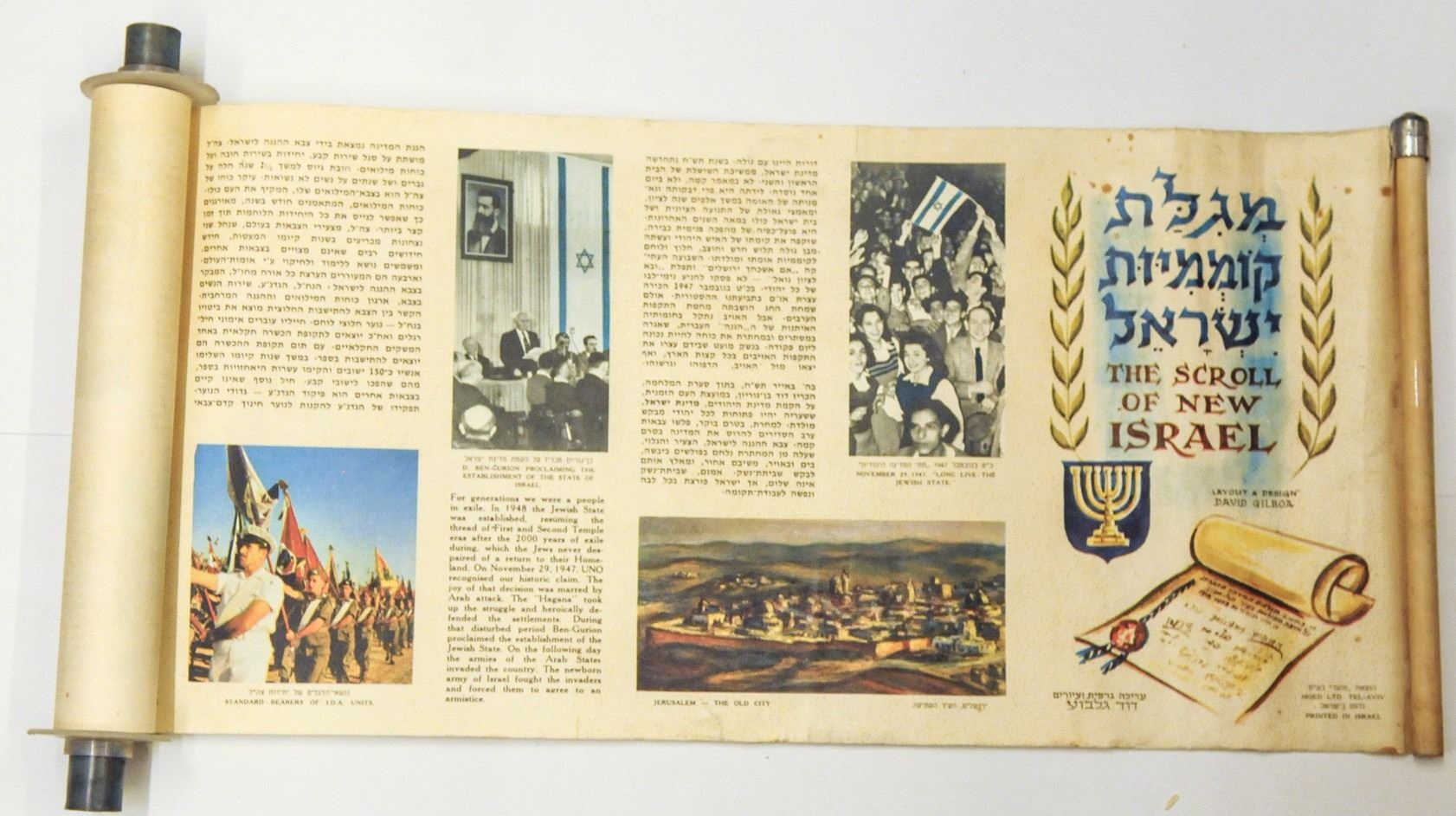 Rare! Megillat Komemiut Israel, design and illustrations by David Gilboa, 1950s, Moed Ltd. Press, length of the scroll: 23 cm. Overall in good condition: some foxing, worn margins, a few tears have been repaired in the endpaper. *Prof. David Yellin (19 March 1864 - 12 December 1941) was a teacher, Hebrew language researcher and public figure, among the founders of the Yeshuv, founder of the David Yellin College, among the founders of the Teacher's Union and the Hebrew Language Boards, and one of the founders of the Zichron Moshe neighbourhood in Jerusalem.