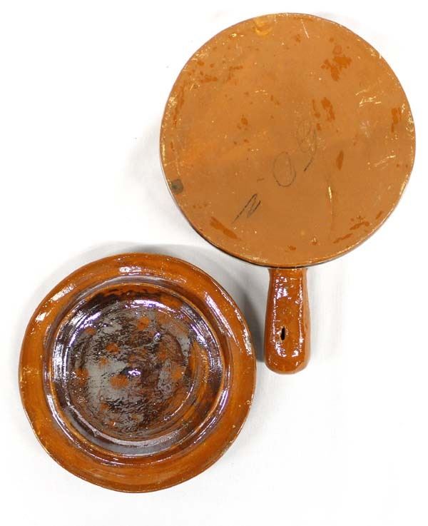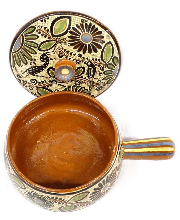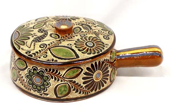Rare Vintage Mexican Redware Pottery Covered Bean Pot by Antonio Rivera of Tlaquepaque, Jalisco, measures 8'' x 11'' x 4'', has handle, beautifully painted with deer and bird motif, artist signature under the lid