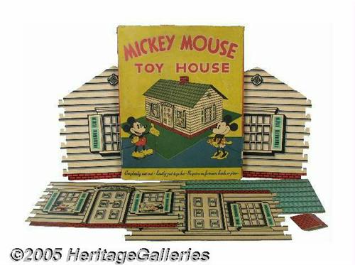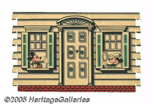 <B>Rare Mickey Mouse Litho House</B></I> Dates from the early 1930s and shows a pie-eyed Mickey Mouse and Minnie Mouse enjoying the American dream of home ownership. The pieces, approximately 9 3/4 inches tall, fit together to make a three dimensional house complete with angled roof. Made by the O. B. Andrews Company of Chattanooga, Tennessee, the house breaks down to fit flat into a multicolored folder picturing the two Disney cartoon character creations on the front. This item is not marked with the normal "Walt E. Disney Ent." logo and therefore may have been only briefly marketed, since it could not have been an authorized version. The Mickey and Minnie pictured here are obviously the early creations of Disney. Made of cardboard and possibly not licensed by Disney make this piece a rarity in it's own right. Condition is bright and clean with only very minor usage and wear to the bends for the doors and windows. All is ready to assemble and even includes the chimney. Lot:253