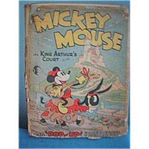 This very rare vintage Pop Up Book, Mickey Mouse in King Arthur's Court, copyright 1933 by Walt Disney Enterprises is in good condition. Published by Blue Ribbon Books, Inc., New York this Pop-Up trade mark is registered #1913797. The book has some spine damage as you can see from my pictures, and some of the pages are loose as a result. The original dust jacket is present but in poor condition. Out of the 4 color pop ups only one has a slight tear leaving the other 3 in very good + condition. Filled with full and half page black and white illustrations this is a wonderful early example by the staff of the Walt Disney Studios. I've shown only 4 photographs, please e-mail me for further pictures if needed. A wonderful addition to any Pop Up or Disney Book Collection. <BR>SH & Ins. will be quoted after orders placed. If you have any questions feel free to contact me and thank you for looking.<BR>