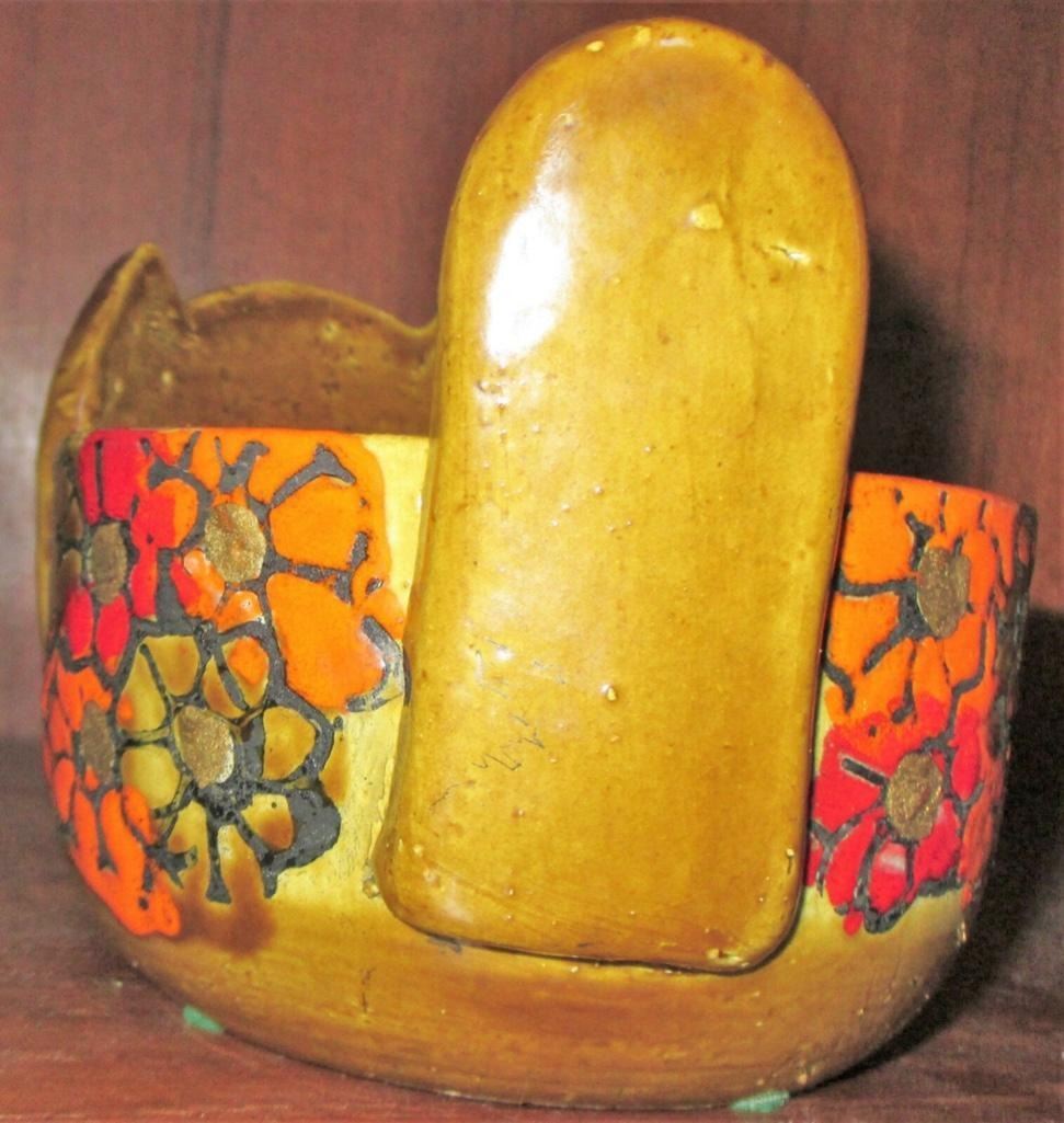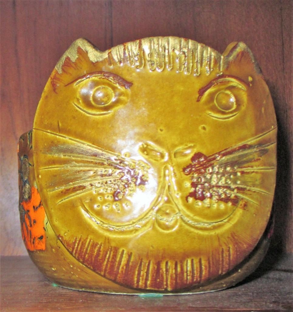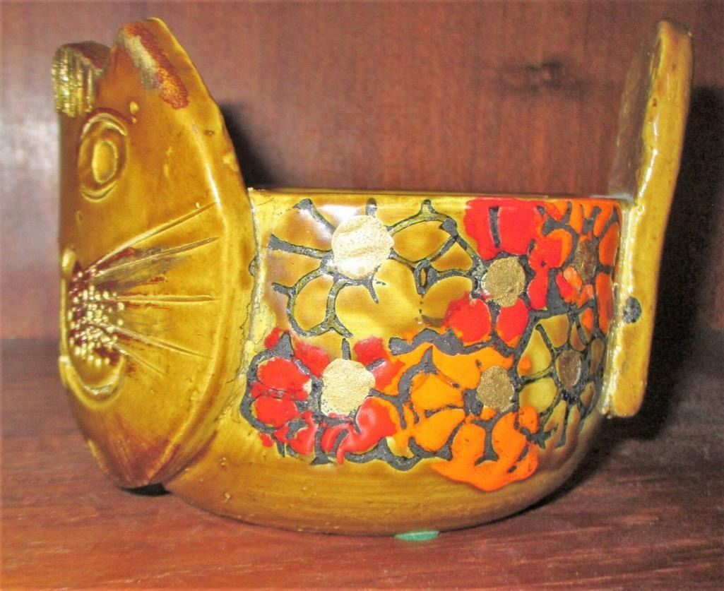 Rare & seldom seen mid century modern Bitossi for Rosenthal Netter figural cat dish/ bowl with original Rosenthal Netter label still attached. Signed 67/9A Italy. Flower design painted in wonderful vintage colors - orange, gold & red on each side, the face trimmed in gold. Measures roughly 5" diameter.Â